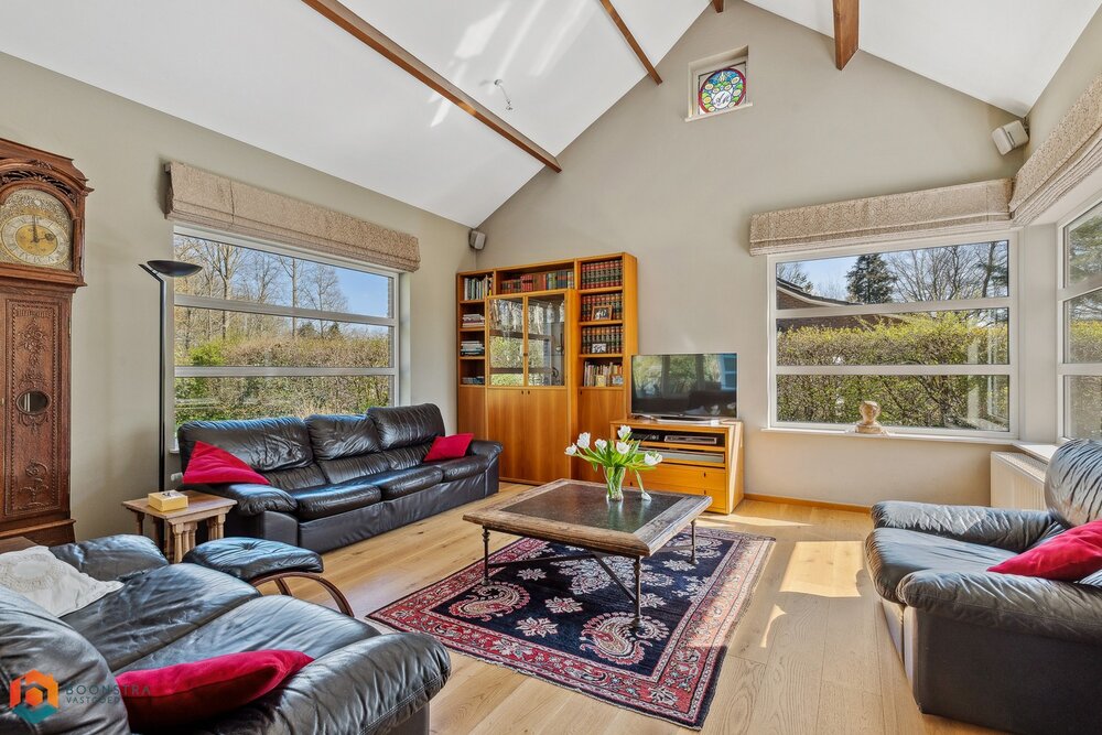 We betreden de woning via de inkomhal met apart gastentoilet en vestiaire. De ruime leefruimte geniet van erg veel lichtinval door de grote raampartijen. U kunt deze inrichten met een gezellige zithoek en een aparte eetplaats met fantastisch uitzicht op de uitgestrekte tuin. Een speksteenkachel zorgt daarbij voor extra sfeer en gezelligheid. De aangrenzende keuken is mooi geïntegreerd in het geheel en voorzien van de voornaamste, kwalitatieve toestellen. Op het gelijkvloers beschikt u verder nog over een inpandige garage voor 2 wagens en een eerste slaapkamer met ensuite badkamer, voorzien van douche, ligbad, dubbele lavabo en toilet. De nachthal op de eerste verdieping geeft ons toegang tot 4 slaapkamers (waarvan 1 met dakterras) en een polyvalente kantoorruimte. Verder beschikt deze verdieping nog over een apart toilet en een badkamer uitgerust met douche, ligbad en lavabo. Tot slot is dit pand voorzien van een ruime kelderverdieping met wasplaats, 2 polyvalente ruimtes, koele berging en een kruipruimte. In de natuurlijke tuin met groot aangelegd terras kunt u steeds in alle rust en privacy genieten van het mooie weer. Deze woning beschikt over 29 zonnepanelen, airco en een alarminstallatie. Tenslotte biedt de ruime oprit voldoende parkeermogelijkheden.