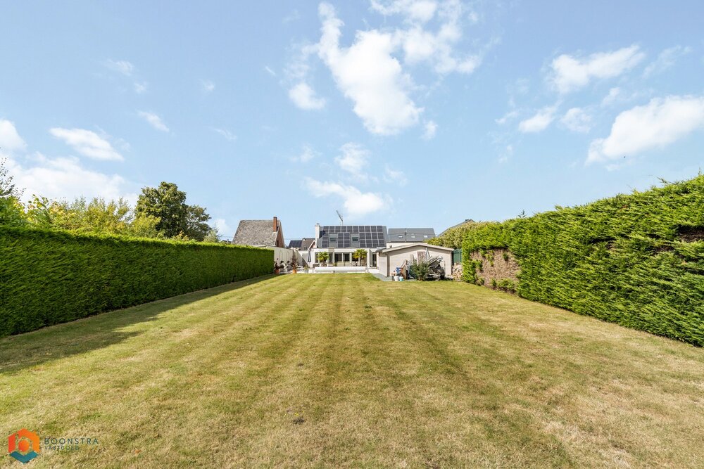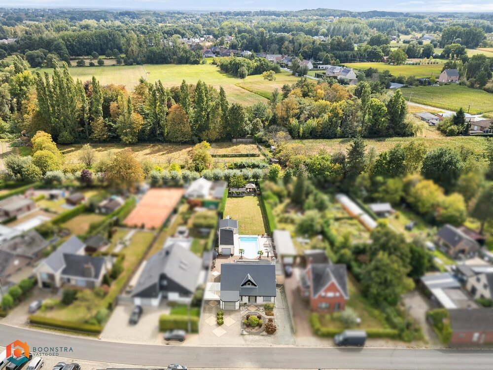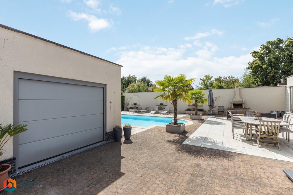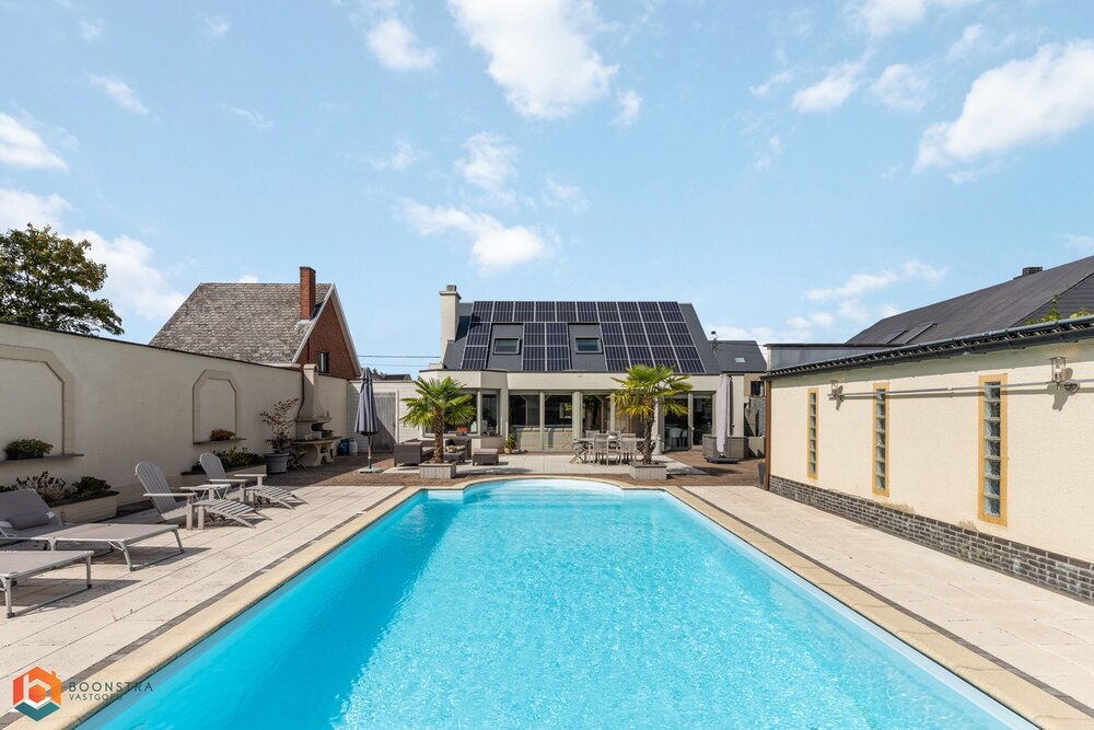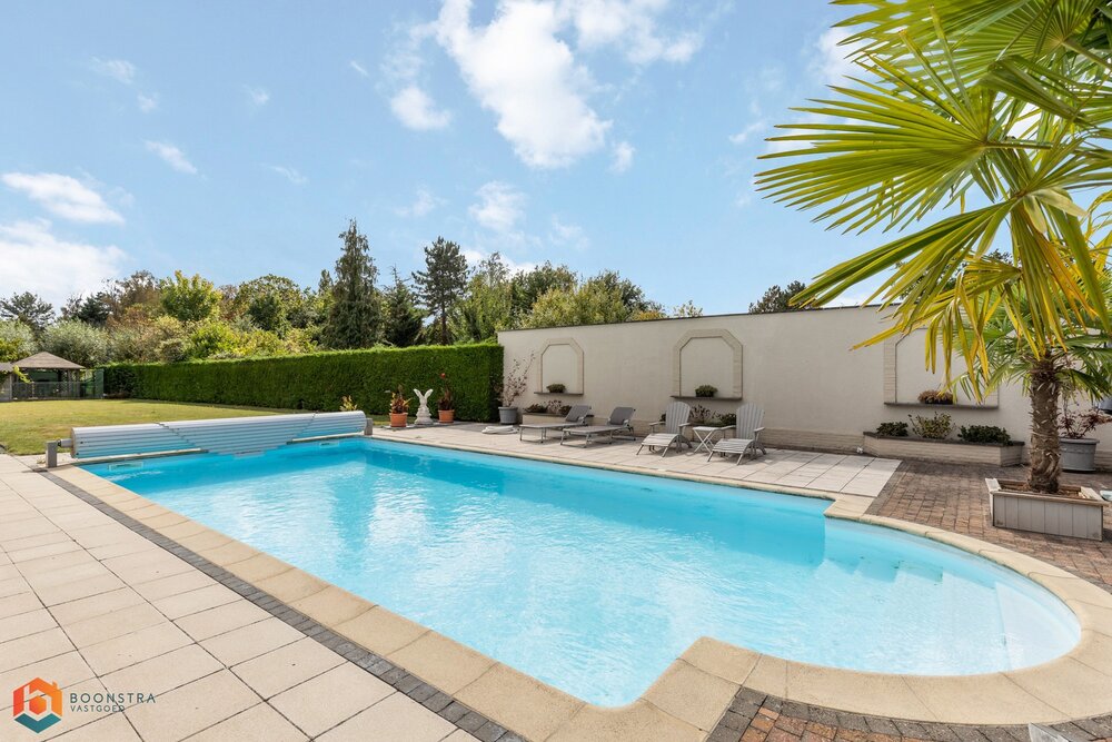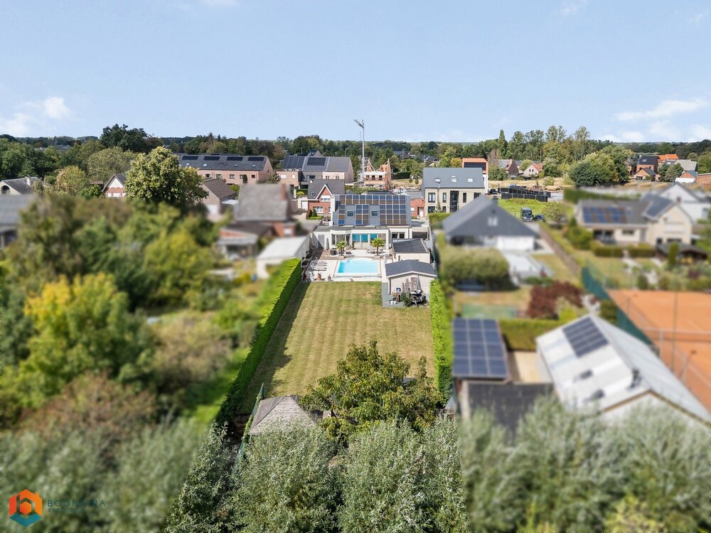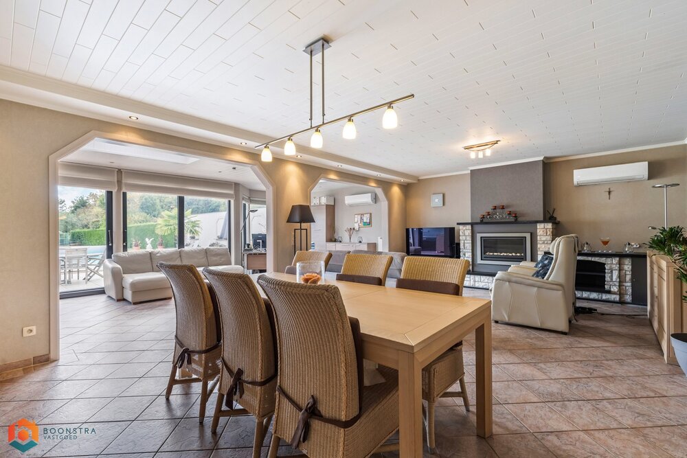 We betreden de woning via de inkomhal met apart gastentoilet en vestiaire. De ruime leefruimte geniet van erg veel lichtinval door de grote raampartijen en is voorzien van airco. U kunt deze inrichten met een gezellige zithoek, een aparte eetplaats en een tweede woonkamer met fantastisch uitzicht op de tuin. De aangrenzende keuken is mooi geïntegreerd in het geheel en voorzien van de voornaamste, kwalitatieve toestellen. Op het gelijkvloers beschikt u verder nog over een wasplaats met douche mogelijkheid, een inpandige garage en een eerste slaapkamer. De nachthal op de eerste verdieping geeft ons toegang tot 4 slaapkamers waarvan de master-bedroom voorzien is van airco. Verder beschikt deze verdieping nog over een recent vernieuwde badkamer uitgerust met wellnessbad, lavabo en toilet. De ganse eerste verdieping werd recent geheel opgefrist. In de ruime tuin met zwembad en groot aangelegd terras kunt u steeds in alle rust en privacy genieten van het mooie weer. Deze woning beschikt over 24 zonnepanelen, airco een extra garage en een tuinhuis. Tenslotte biedt de ruime oprit voldoende parkeermogelijkheden.