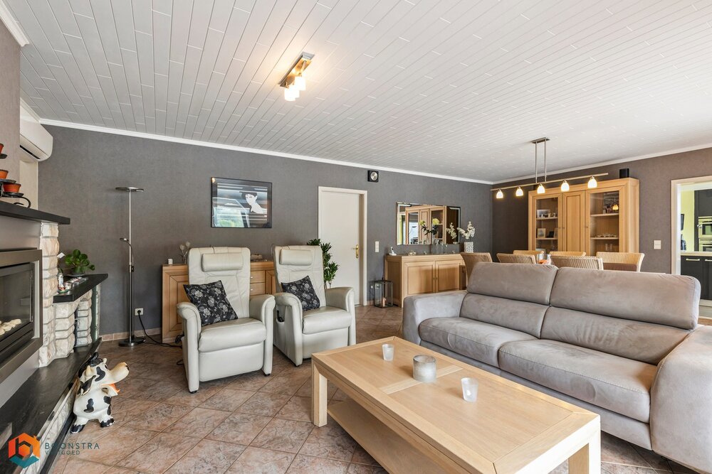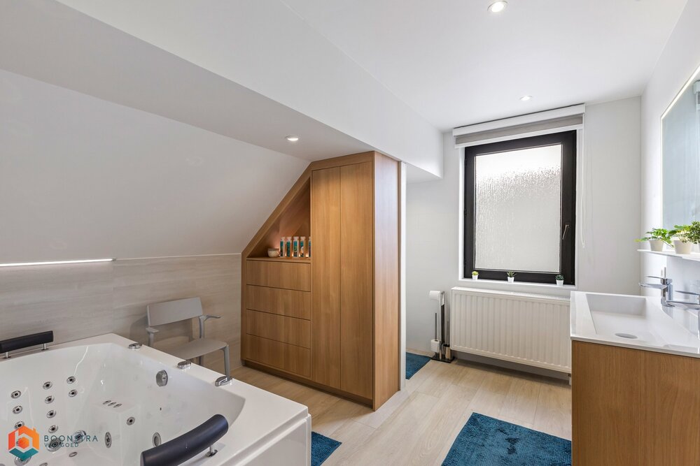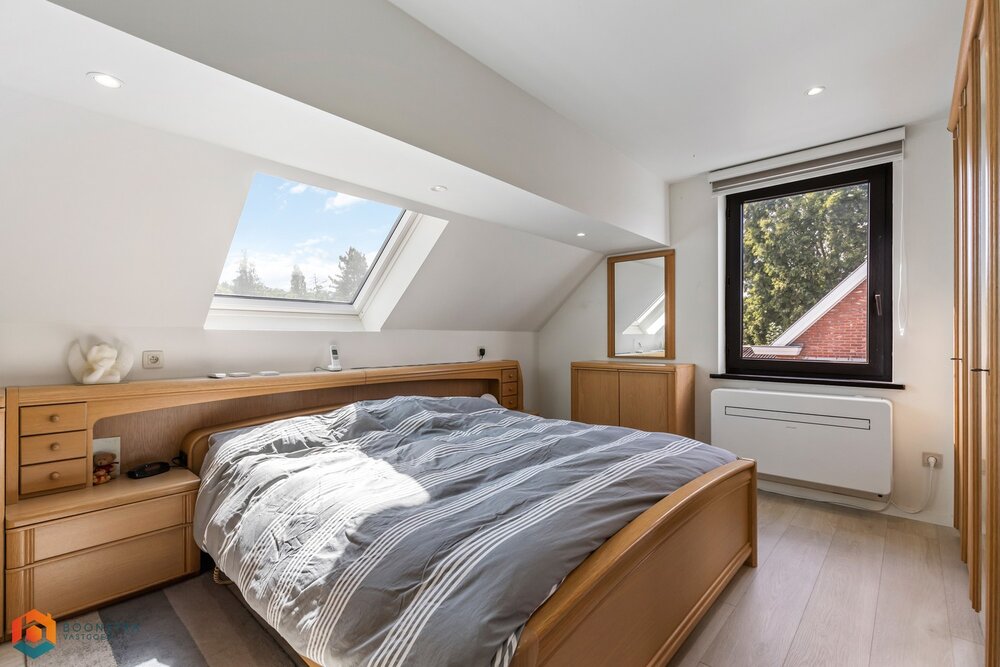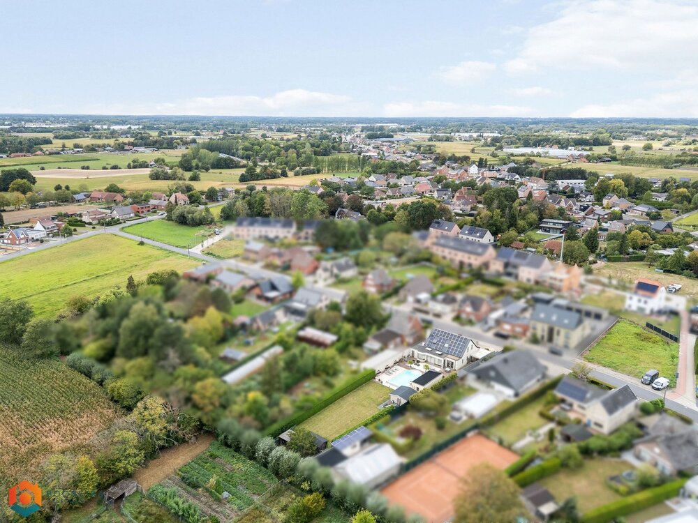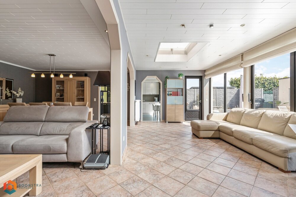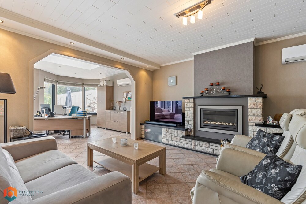 We betreden de woning via de inkomhal met apart gastentoilet en vestiaire. De ruime leefruimte geniet van erg veel lichtinval door de grote raampartijen en is voorzien van airco. U kunt deze inrichten met een gezellige zithoek, een aparte eetplaats en een tweede woonkamer met fantastisch uitzicht op de tuin. De aangrenzende keuken is mooi geïntegreerd in het geheel en voorzien van de voornaamste, kwalitatieve toestellen. Op het gelijkvloers beschikt u verder nog over een wasplaats met douche mogelijkheid, een inpandige garage en een eerste slaapkamer. De nachthal op de eerste verdieping geeft ons toegang tot 4 slaapkamers waarvan de master-bedroom voorzien is van airco. Verder beschikt deze verdieping nog over een recent vernieuwde badkamer uitgerust met wellnessbad, lavabo en toilet. De ganse eerste verdieping werd recent geheel opgefrist. In de ruime tuin met zwembad en groot aangelegd terras kunt u steeds in alle rust en privacy genieten van het mooie weer. Deze woning beschikt over 24 zonnepanelen, airco een extra garage en een tuinhuis. Tenslotte biedt de ruime oprit voldoende parkeermogelijkheden.