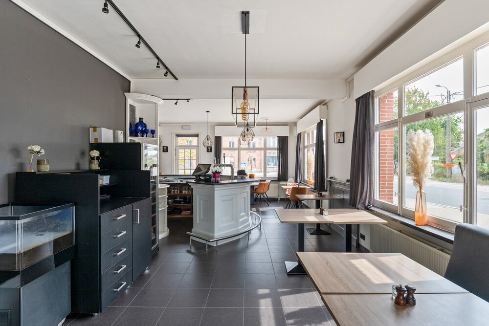 Momenteel is het gelijkvloers ingericht als restaurant, uitgerust met een volledig ingerichte keuken, toog, veranda en een ruim terras. Hier beschikt u dus over meerdere grote ruimtes die perfect kunnen worden heringericht tot een comfortabele en eigentijdse woning. Denk hierbij aan een lichtrijke leefruimte, open keuken met eetplaats, bureauruimte, hobby- of speelkamer en meerdere bergingen. De bovenliggende woonst is bereikbaar via een aparte inkom. Hier beschikt u momenteel al over een ruime leefruimte met veel lichtinval en een badkamer uitgerust met lavabo, ligbad en voorziening voor wasmachine.