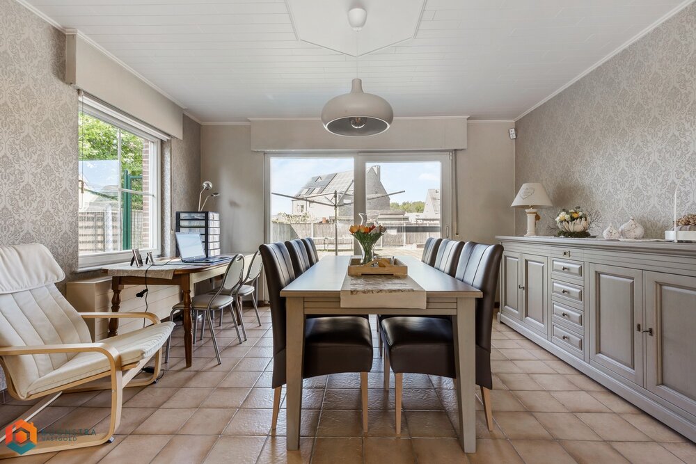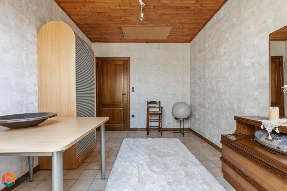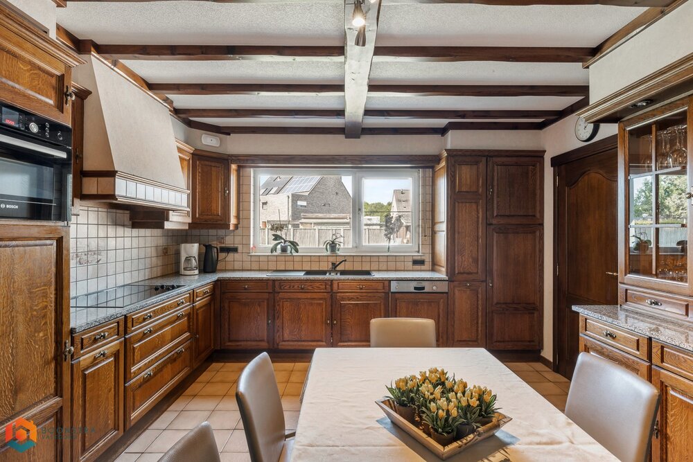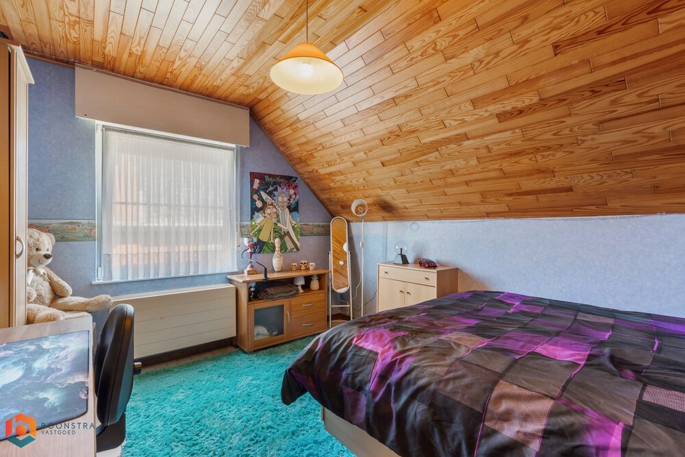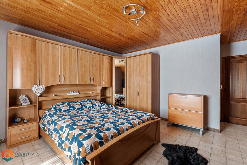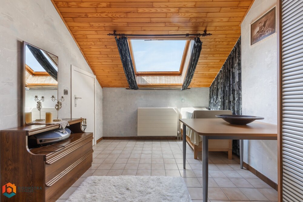 We betreden de woning via de inkomhal. De leefruimte geniet van veel lichtinval door de vele raampartijen en kunt u inrichten met een gezellige zithoek, voorzien van een gezellige haard en aparte eetplaats. Van hieruit hebt u ook een mooi zicht op de leuke tuin. De ruime keuken is voorzien van de voornaamste toestellen, met aangrenzend een aparte ruime berging. U beschikt verder op het gelijkvloers nog over een badkamer met bad, douche en lavabo en een ruime inpandige garage. De nachthal op de eerste verdieping geeft ons toegang tot de 4 ruime slaapkamers en een apart toilet. De zolder is ruim en wordt gebruikt als extra opbergruimte. In de leuke tuin kunt u steeds in alle rust en privacy genieten van het mooie weer. Vooraan de woning beschikt u over voldoende parkeermogelijkheden.