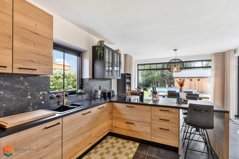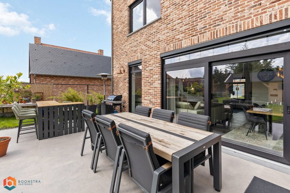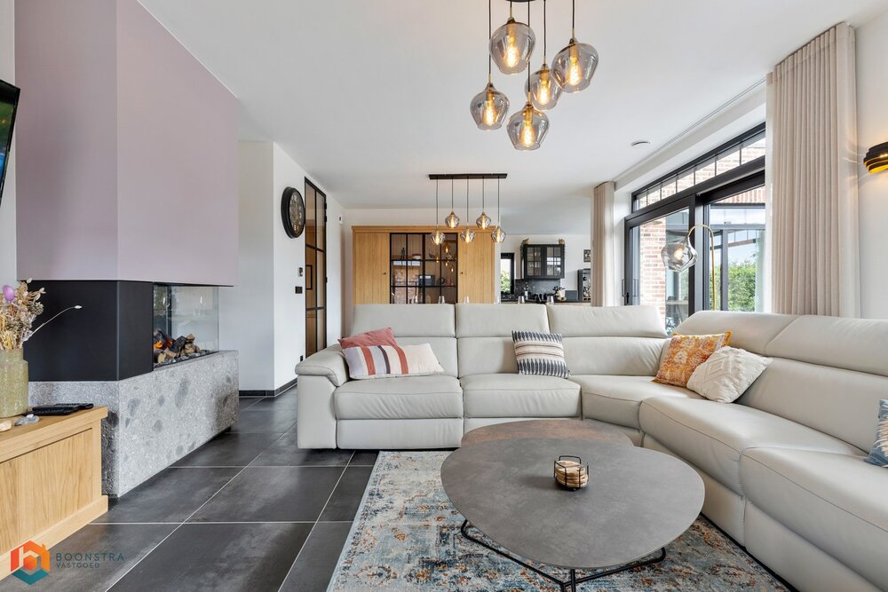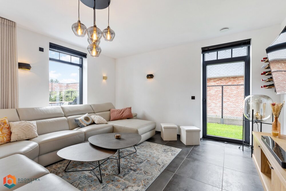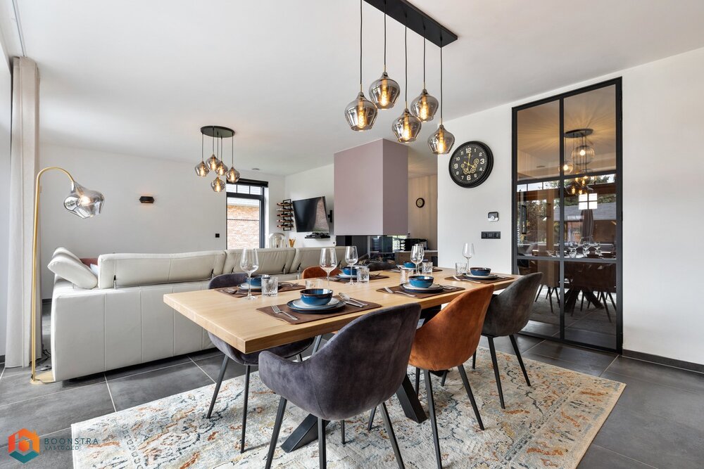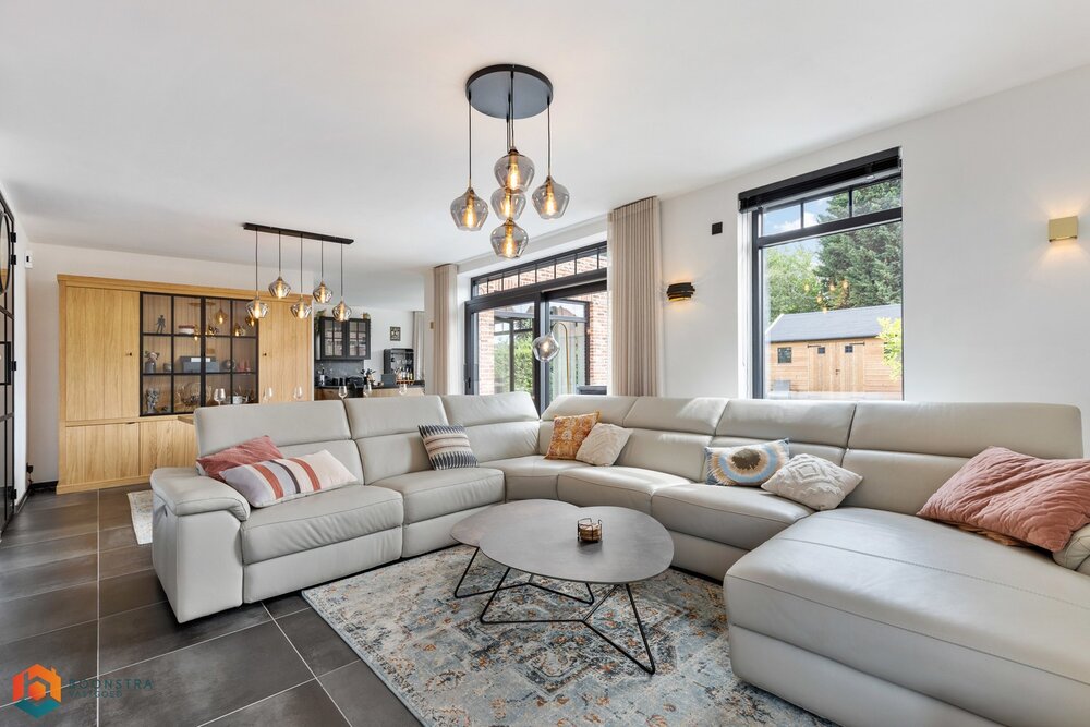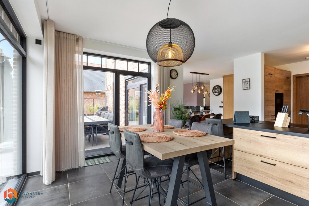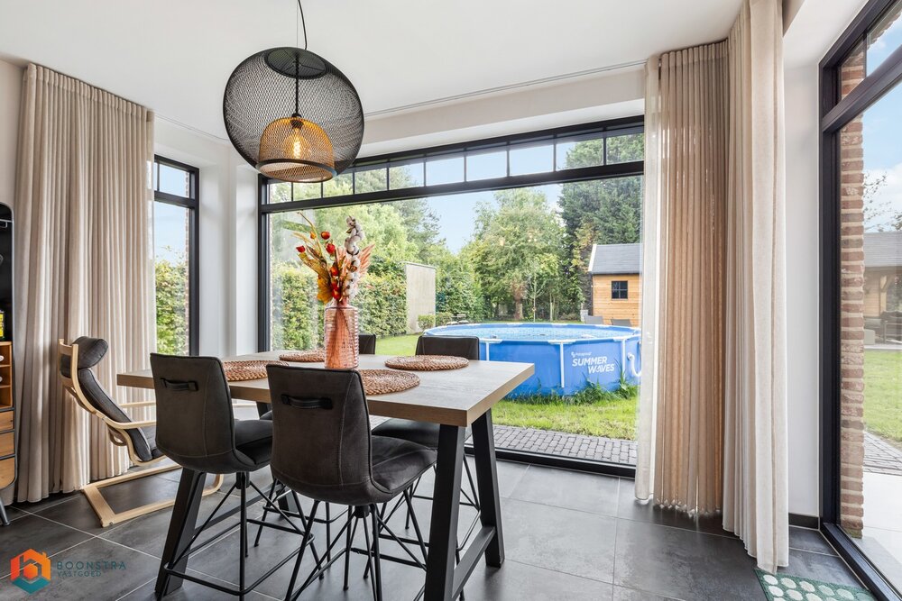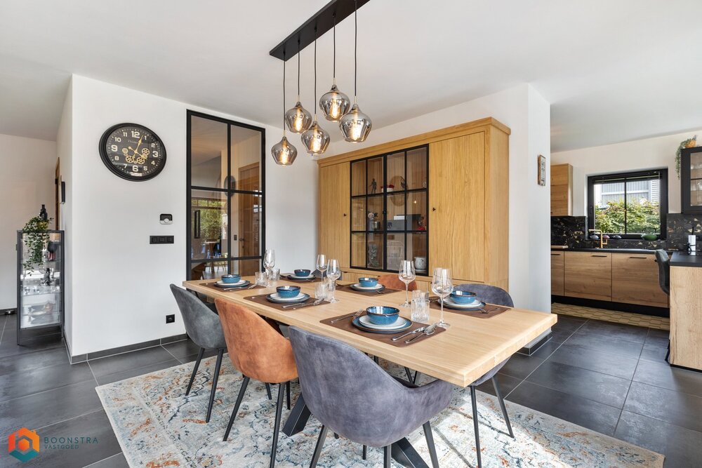 Bij binnenkomst verwelkomt de ruime inkomhal u, voorzien van een apart gastentoilet. De lichtrijke leefruimte geniet van royale raampartijen, wat zorgt voor een warme en uitnodigende sfeer. Hier vindt u voldoende ruimte voor een gezellige zithoek én een afzonderlijke eetkamer met uitzicht op de mooie tuin.