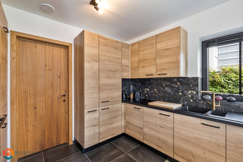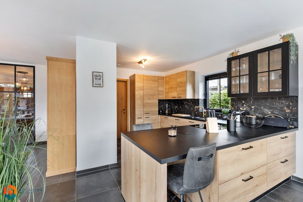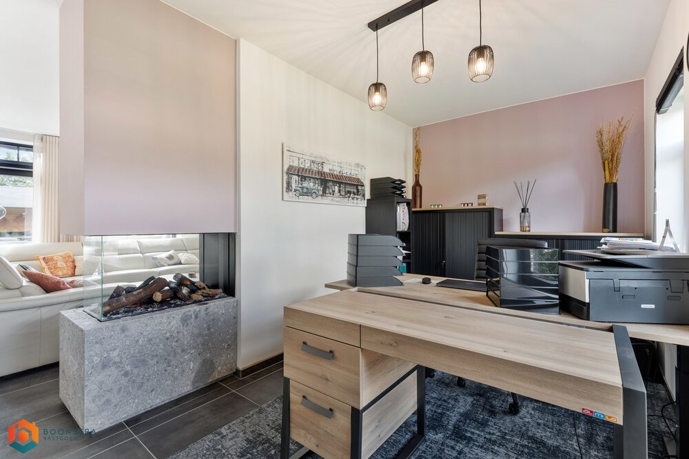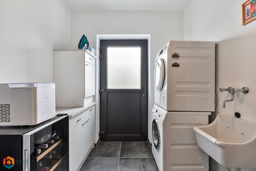 De aangrenzende keuken is volledig uitgerust met topkwaliteit toestellen en biedt directe toegang tot een handige berging/wasruimte. Op het gelijkvloers beschikt u verder over een ruime inpandige garage én een multifunctionele bureauruimte.