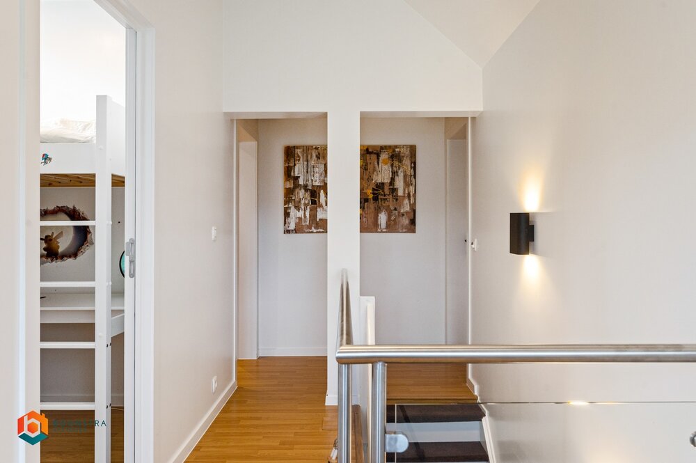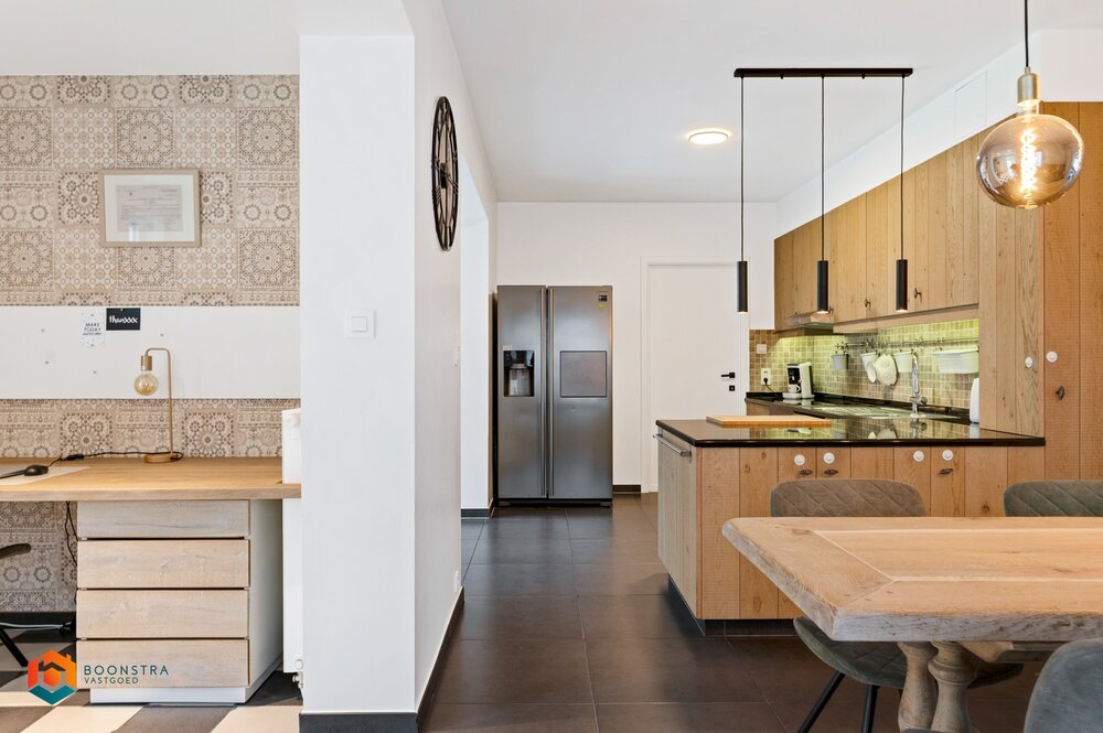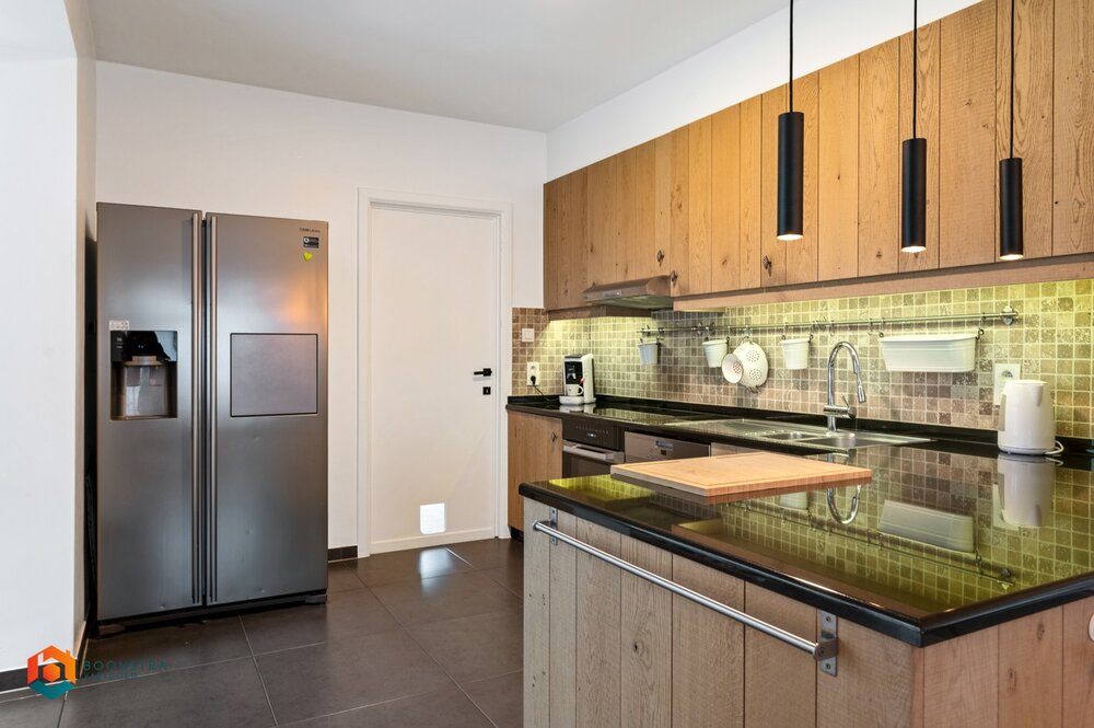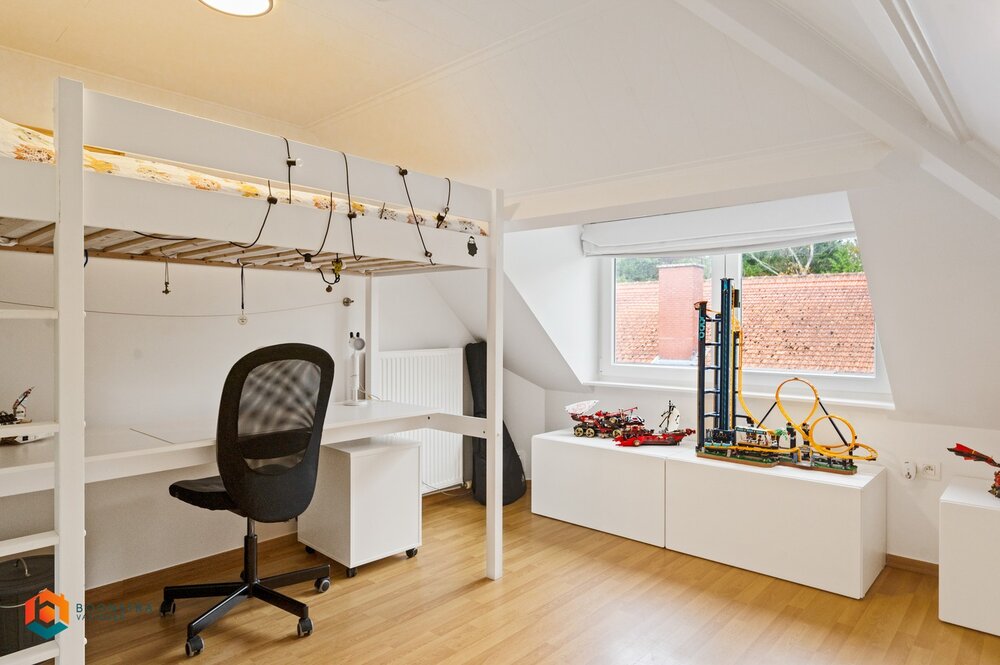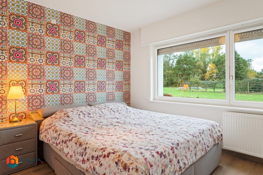 We betreden de woning via de inkomhal. De leefruimte geniet van veel lichtinval door de vele raampartijen. Deze kunt u inrichten met een gezellige zithoek, een aparte eetplaats en een open bureau. De smaakvolle keuken is daarbij mooi geïntegreerd in het geheel en voorzien van de voornaamste, kwalitatieve toestellen. Aansluitend bevindt zich de praktische berging/wasplaats inclusief douche en een apart toilet. Een lichtrijke veranda vormt de connectie tussen keuken en tuin. Tot slot beschikt het gelijkvloers nog over een eerste slaapkamer met ingebouwde kastenwand. De nachthal op de eerste verdieping geeft ons toegang tot 3 volwaardige slaapkamers en de ruime badkamer voorzien van dubbele lavabo, hoekbad en toilet. In de verzorgde tuin met aangelegd terras kunt u steeds in alle rust en privacy genieten van het mooie weer en het achtergelegen groen. Een zeer ruime garage met sectionaalpoort en een aparte fietsenberging bieden u daarbij voldoende ruimte voor opslag van al uw tuinspullen en/of fietsen. Deze woning beschikt tenslotte nog over een kelder en is voorzien van 15 zonnepanelen. De elektriciteit is conform.