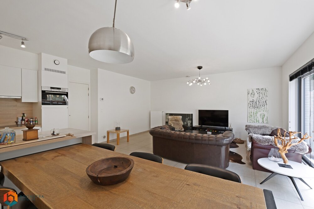 We betreden deze woning via de inkomhal met gastentoilet. Het gelijkvloers beschikt over een open leefruimte met open keuken, waar plaats is voor een gezellige zithoek en aparte eetkamer. U geniet hier van veel natuurlijk licht door de grote raampartij. De open leefkeuken is uitgerust met kwalitatieve toestellen en combineert strak design met functioneel comfort. Naastgelegen is een functionele berging, ideaal voor extra opslagruimte.
