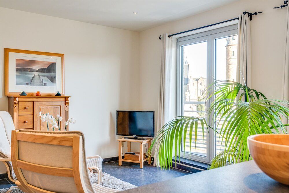 We betreden het appartement via de inkomhal. De leefruimte geniet van veel lichtinval door de grote raampartijen. Hier kunt u een eetplaats en gezellige zithoek inrichten. De open keuken is mooi geïntegreerd in het geheel en voorzien van alle toestellen. Aangrenzend aan de keuken bevindt zich de berging/wasruimte. Verder omvat het appartement 2 slaapkamers, apart toilet en de badkamer voorzien van lavabo en inloopdouche. Op het aangename terras kunt u steeds in alle rust en privacy genieten van het mooie weer. U beschikt ook over een bovengrondse autostaanplaats en kelderberging. €50 vaste kost/maand.