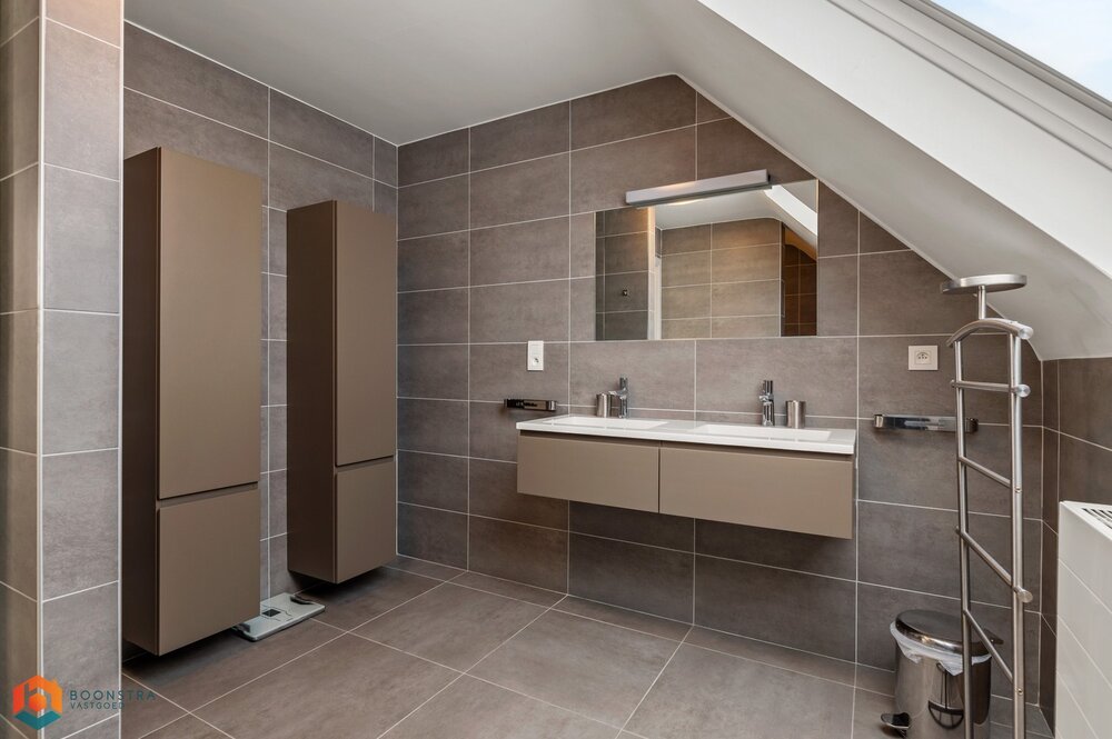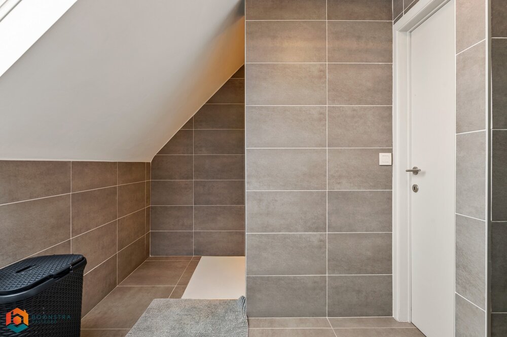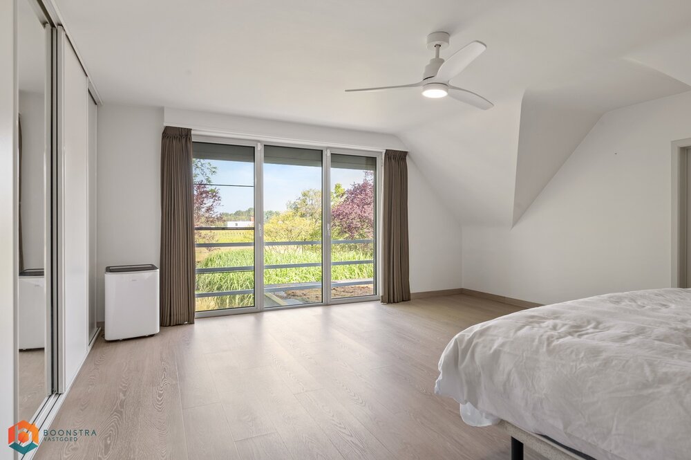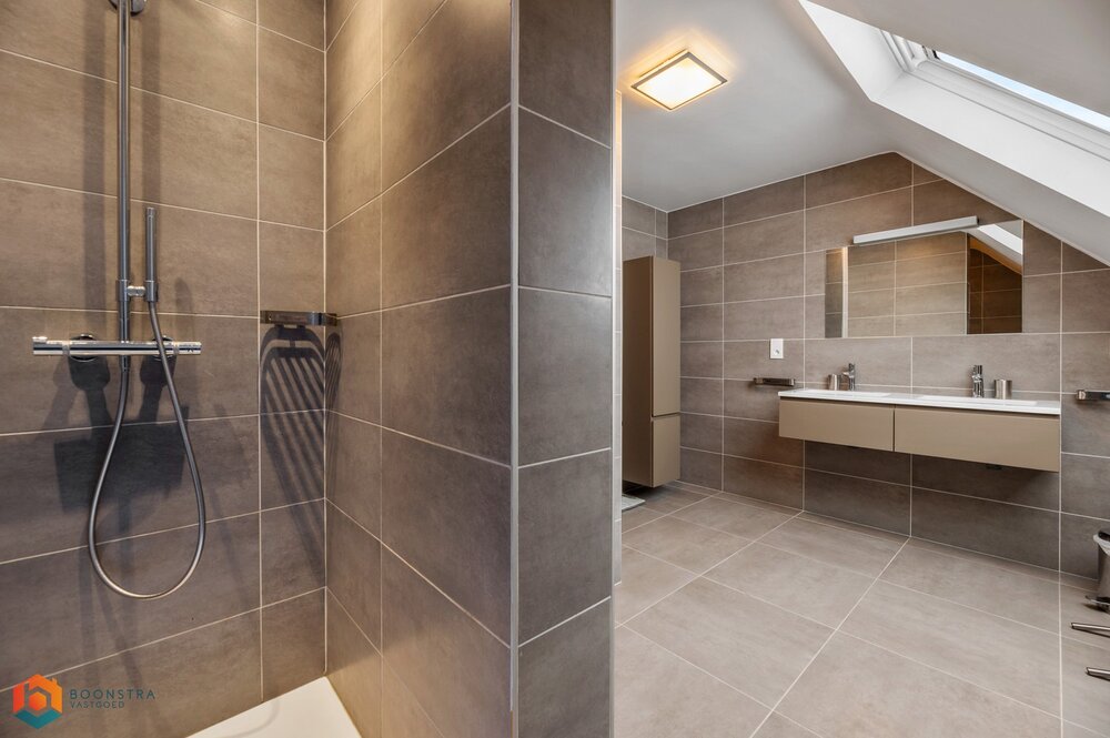 Op de eerste verdieping brengt de nachthal ons naar de ruime masterbedroom, voorzien van een aansluitende ruimte die perfect kan ingericht worden als ruime dressing. Daarnaast vinden we nog 2 ruime, comfortabele slaapkamers, een berging en een zeer ruime badkamer uitgerust met een dubbele lavabo en een inloopdouche. Ook hier werd veel aandacht besteed aan licht en ruimte. Een apart toilet vervolledigt deze verdieping.