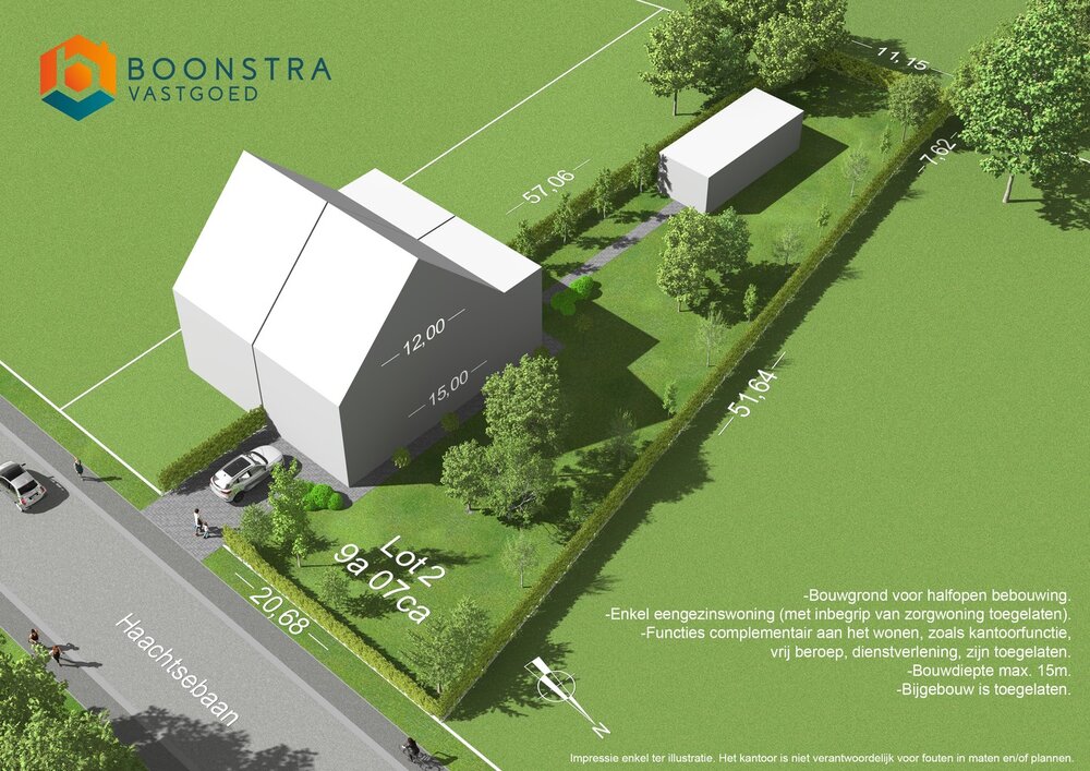 Deze bouwgrond biedt tal van stedenbouwkundige mogelijkheden. De render geeft een weergave van een mogelijke woning volgens de geldende bouwvoorschriften conform de verkaveling. Het perceel aan de rechterzijde bevindt zich in agrarisch gebied, waardoor dit op heden niet voor residentiele doeleinden bebouwd mag worden.