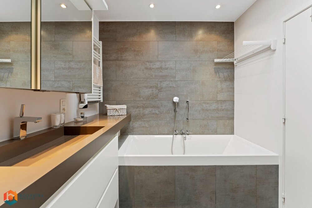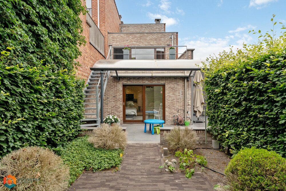 Via de inkomhal met apart toilet betreden we de bovenliggende woonst. De ruime leefruimte met parketvloer en open haard geniet van veel lichtinval door de grote raampartijen en kunt u inrichten met een zithoek en aparte eetplaats. De keuken is mooi geïntegreerd in het geheel en voorzien van de kwalitatieve toestellen. Van hieruit heeft u toegang tot het dakterras alsook de volledig aangelegde tuin, waar u steeds in alle rust en privacy kan genieten van het mooie weer. Aanpalend aan de keuken bevindt zich nog een berging. Via de nachthal bereiken we de tweede verdieping waarop er zich 3 slaapkamers, een apart toilet en een badkamer uitgerust met lavabo, ligbad en inloopdouche bevinden. Tevens is deze woning voorzien van 12 zonnepanelen. U beschikt ook over voldoende parkeermogelijkheden aan het pand.