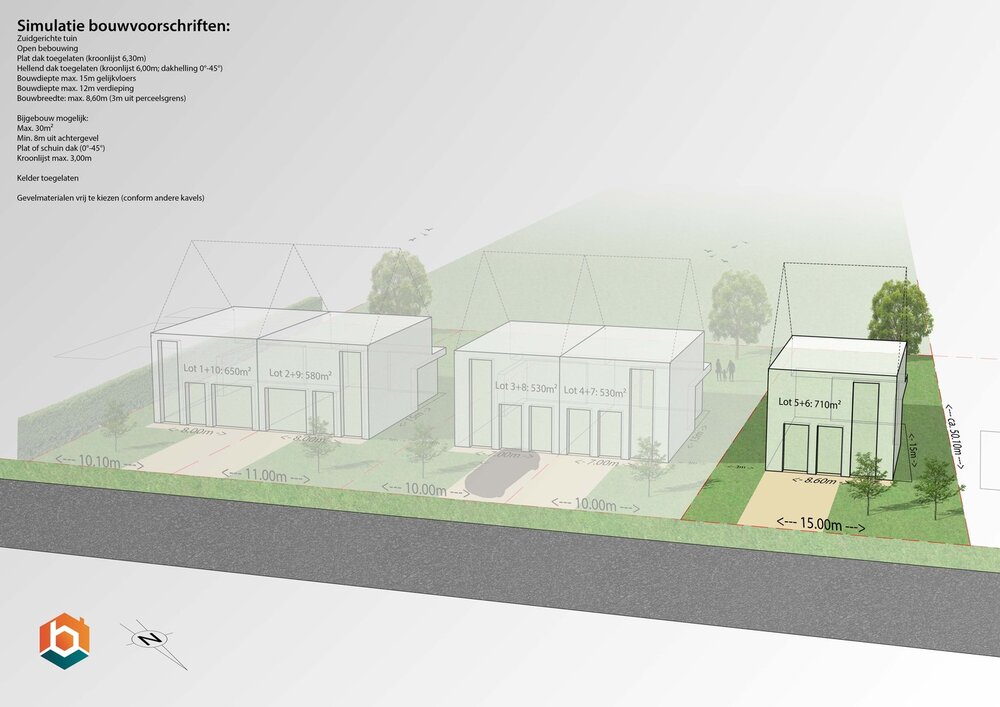 1. Gevelbreedte: max. 8,60m vooraan en max. 7,50m achteraan (3m van perceelsgrenzen)
