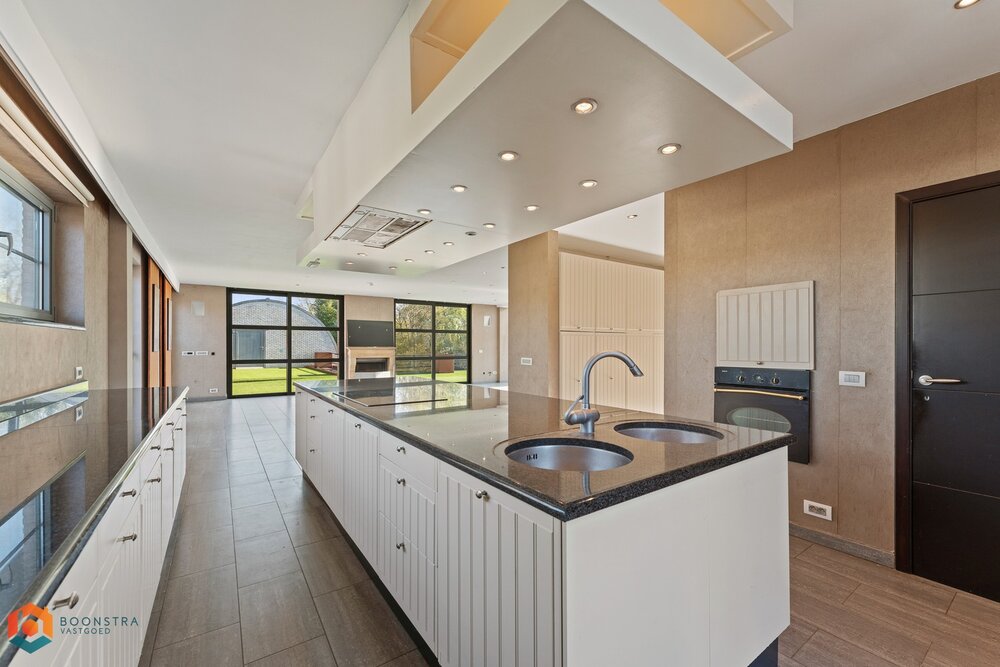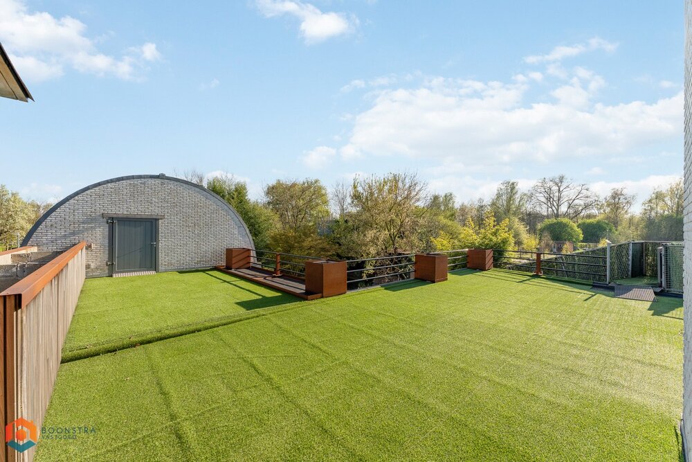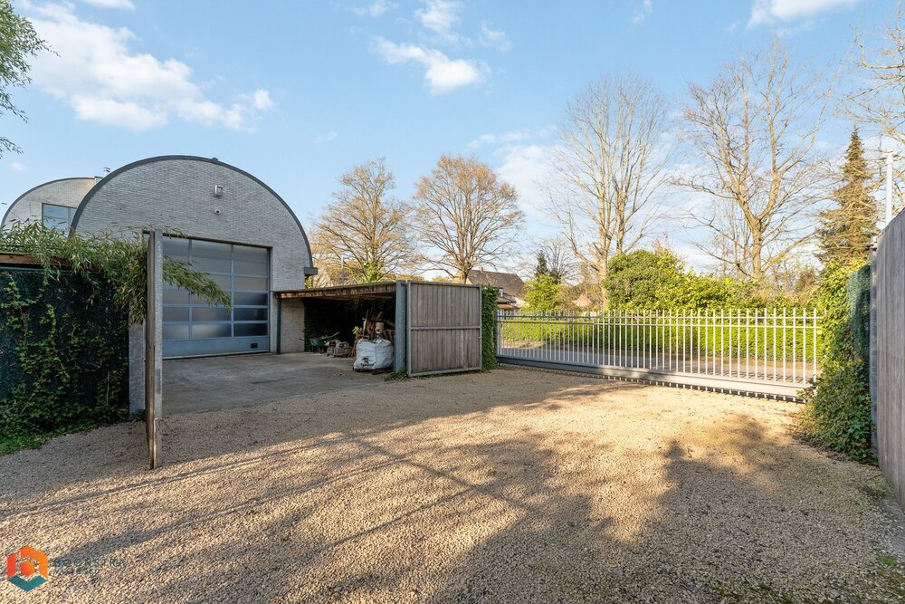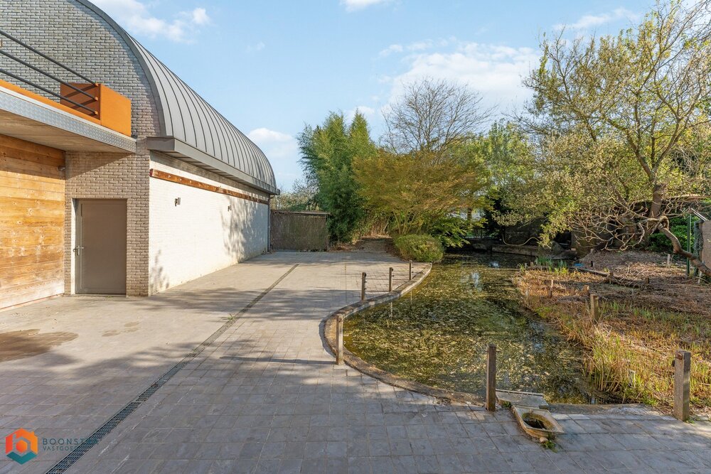 De tuin is volledig zuidgericht en prachtig aangelegd met volwassen beplanting. Ze vormt een ware oase van rust, voorzien van een koi- of zwemvijver (100000l). In een afgescheiden gedeelte van de tuin bevindt zich extra bergruimte, ondergebracht in zeecontainers. Ook aan parkeergelegenheid is er geen gebrek. Mogelijkheid tot 10 parkings.