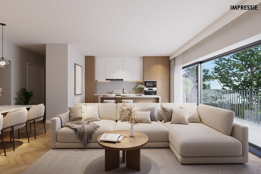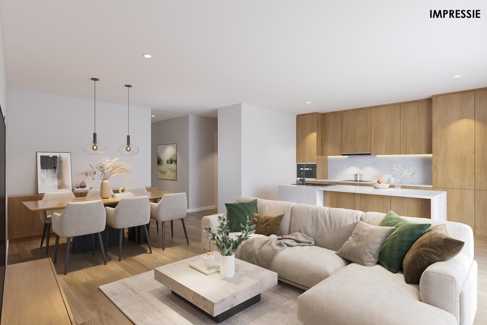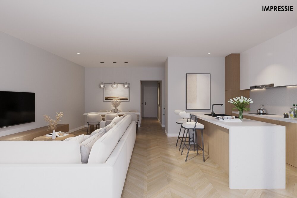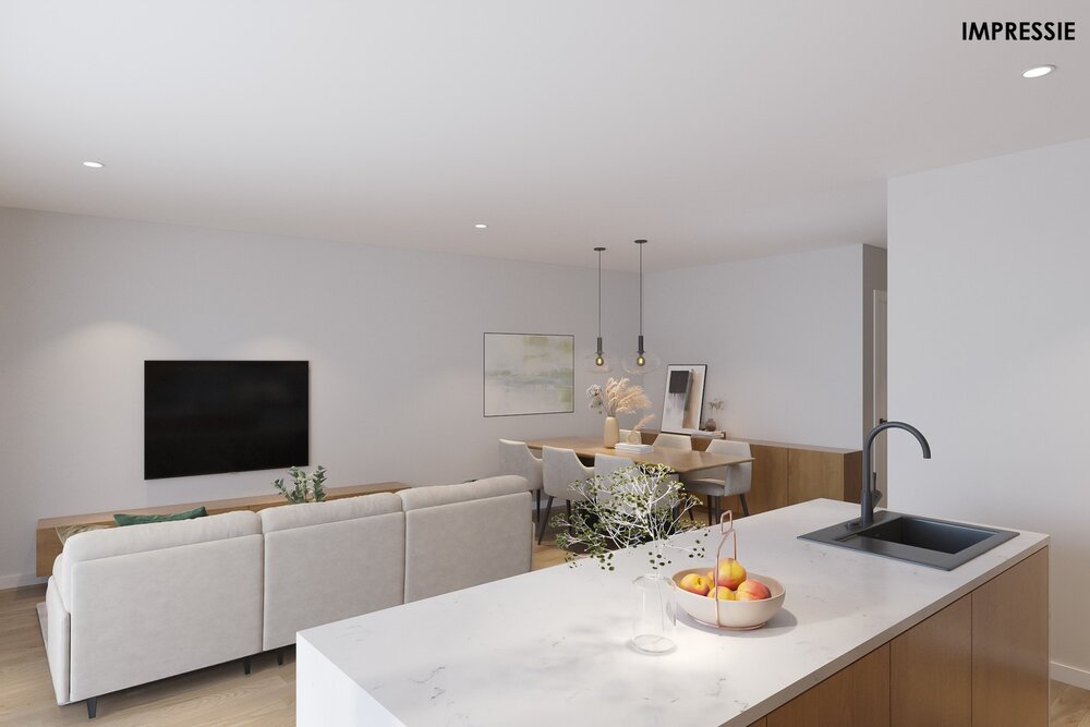 We betreden het appartement op de eerste verdieping via de inkomhal. De ruime leefruimte zal van veel lichtinval genieten door de grote raampartijen. Hier kunt u een gezellige zithoek en aparte eetplaats inrichten. Vanuit de leefruimte heeft u toegang tot het goed georiënteerde terras, waar u steeds in alle rust en privacy kunt genieten van het mooie weer. De open keuken is verder mooi geïntegreerd in het geheel en standaard voorzien van kwalitatieve toestellen. Grenzend aan de keuken bevindt zich een aparte berging. Verder geeft de hal nog toegang tot 2 slaapkamers, een apart toilet en een volledig ingerichte badkamer. U dient ook een bovengrondse staanplaats en kelderberging bij aan te kopen.