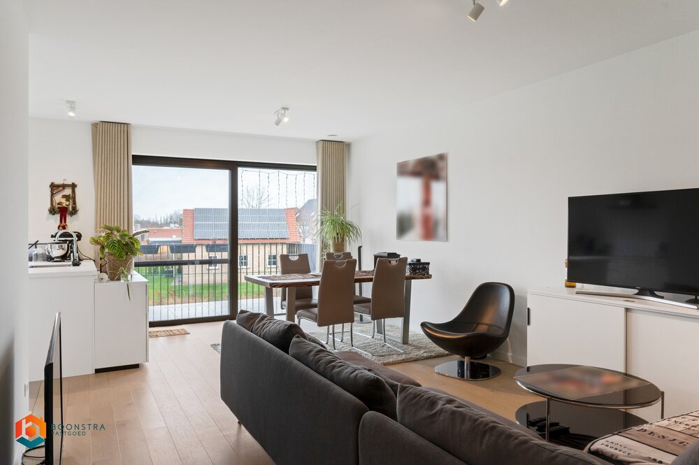 Dit prachtig appartement op de eerste verdieping geniet van een lichtrijke leefruimte met grote raampartijen. Deze kunt u inrichten met een gezellige zithoek en een aparte eetplaats. Van hieruit heeft u toegang toch het leuke terras met zicht op groene velden en prachtig natuurgebied. De open keuken met eiland is mooi geïntegreerd in het geheel en is standaard voorzien van kwalitatieve toestellen. Aangrenzend bevindt zich de berging/wasruimte. De hal geeft ons verder toegang tot een een apart toilet, twee slaapkamers en de badkamer, uitgerust met dubbele lavabo en inloopdouche. U geniet hier van een ondergrondse parking en kelderberging. De gemeenschappelijke kosten bedragen 75 euro per maand. EPC in opmaak.