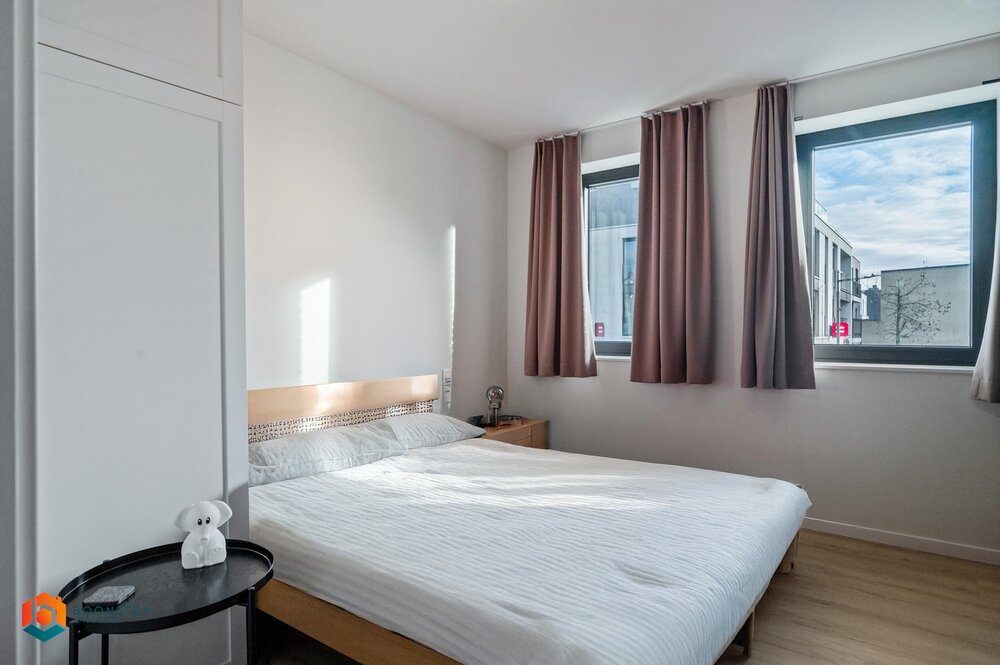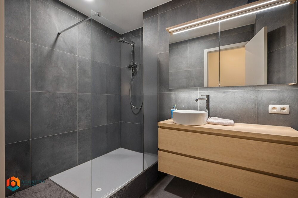 We betreden het appartement via de inkomhal. De leefruimte, die u kan inrichten met een gezellige zithoek en een aparte eetplaats, geniet van veel lichtinval door de grote raampartijen. De open keuken is mooi geïntegreerd in het geheel en voorzien van kwalitatieve toestellen. De hal geeft ons verder toegang tot een berging/wasruimte, een apart toilet, 1 slaapkamer en de badkamer voorzien van een lavabo, inloopdouche en ligbad. Via de leefruimte heeft u toegang tot het terras aan de voorzijde. Het appartement is ook voorzien van een ondergrondse berging en parkeerplaats. De gemeenschappelijke kosten bedragen €75 per maand.