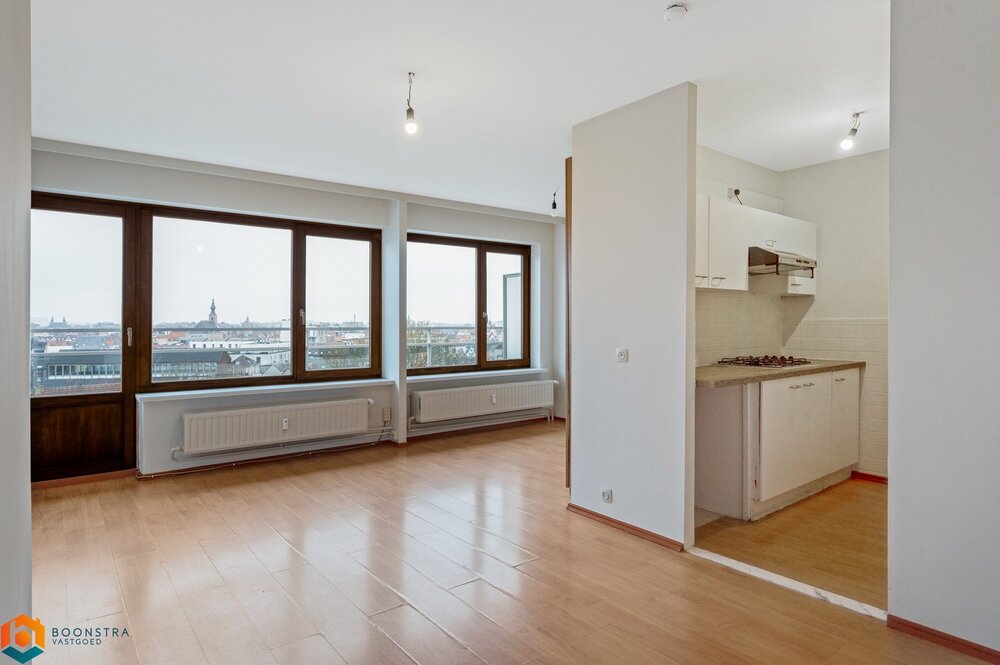 We betreden het appartementsgebouw, "Residentie Berthout", via de royale inkomhal. De lichtrijke studio op de 8ste verdieping betreden we via de inkomhal. Hierlangs bereiken we de woonkamer/slaapkamer. Aangrenzend bevindt zich de keuken, dewelke mooi is geïntegreerd in het geheel en werd voorzien van de voornaamste toestellen. De hal geeft verder toegang tot de badkamer, uitgerust met douche, lavabo en toilet en een vestiaire. Via de leefruimte heeft u toegang tot het leuke terras met een prachtig uitzicht over de sfeervolle stad. Op dit goed-georiënteerde terras kan u steeds in alle rust en privacy genieten van het mooie weer. Het EPC bedraagt slechts 114 (label B).