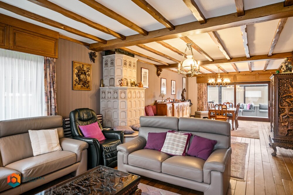 We betreden de woning via een grote inkomhal. De ruime leefruimte kunt u inrichten met een gezellige zithoek en aparte eetplaats. Aangrenzend bevindt zich de ruime en lichtrijke veranda met uitzicht op de grote tuin en de ingerichte keuken die toegang geeft tot de inkomhal en de wasplaats/berging. Verder vindt u op het gelijkvloers een bureau (dewelke kan dienen als extra slaapkamer) en een apart toilet. De nachthal op de eerste verdieping geeft toegang tot de 3 ruime slaapkamers met ingemaakte kasten en een badkamer voorzien van een toilet en ligbad met douche. In de grote tuin kunt u steeds in alle rust en privacy genieten van het mooie weer. In de tuin bevindt zich een ruime garage en een grote hobbyruimte, deze zijn beide toegankelijk via de oprit naast het huis.