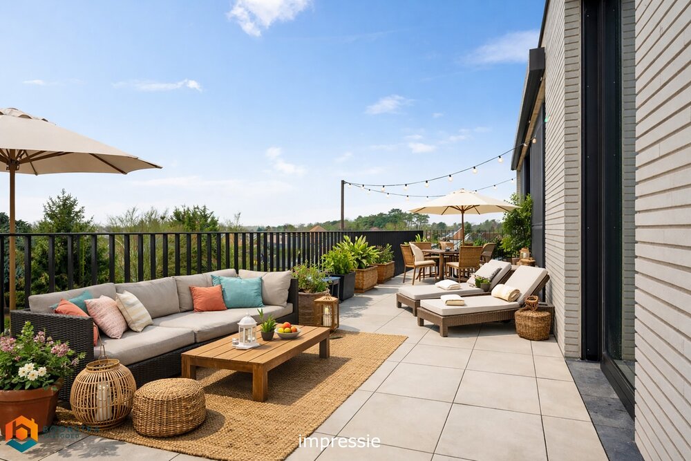 De open keuken is harmonieus geïntegreerd in het geheel en voorzien van kwalitatieve toestellen. Aansluitend bevindt zich een praktische wasplaats/berging. Zowel de leefruimte als één van de slaapkamers geven toegang tot het ruime terras van 29 m², waar u in alle rust en privacy kunt genieten van de namiddag- en avondzon. Het terras is bovendien uitgerust met een zonneluifel.
