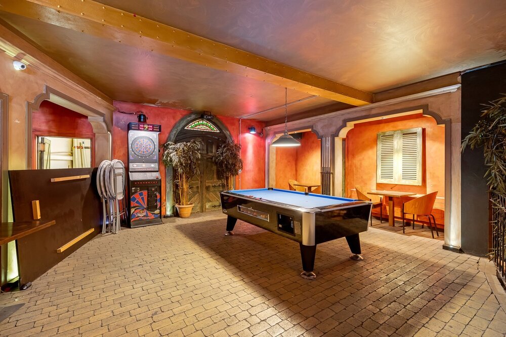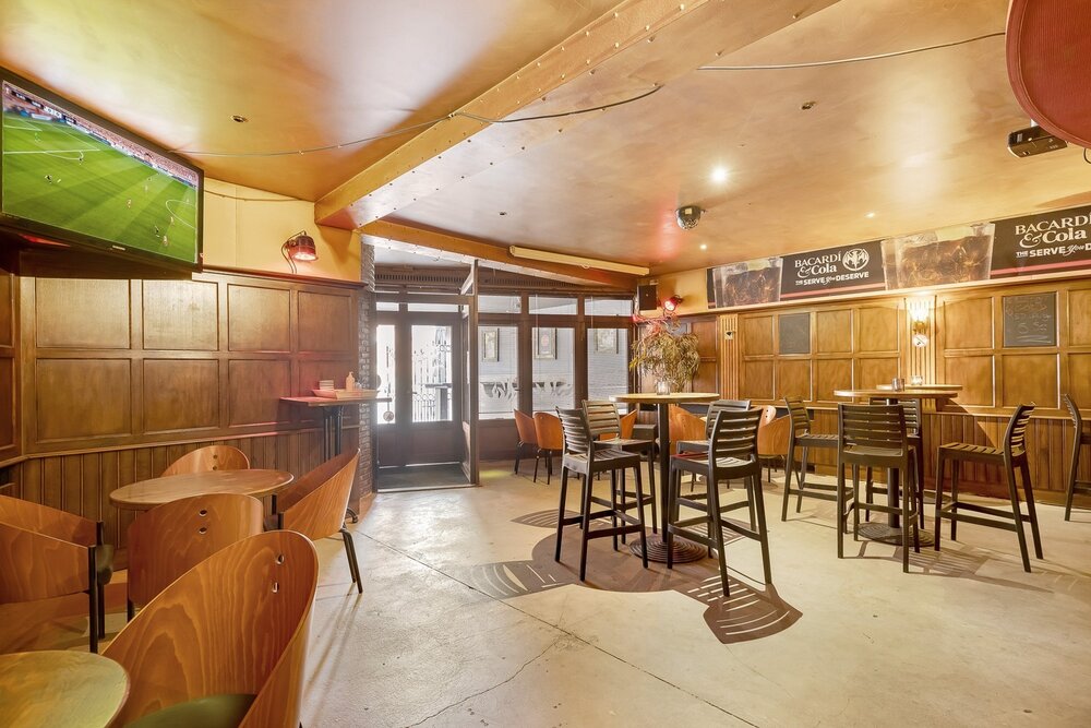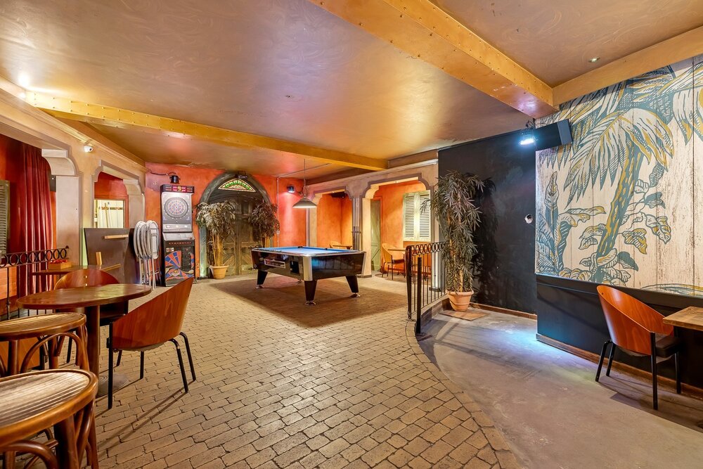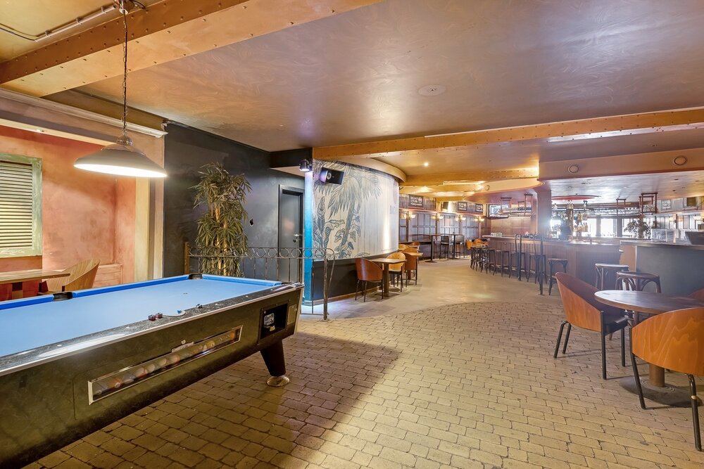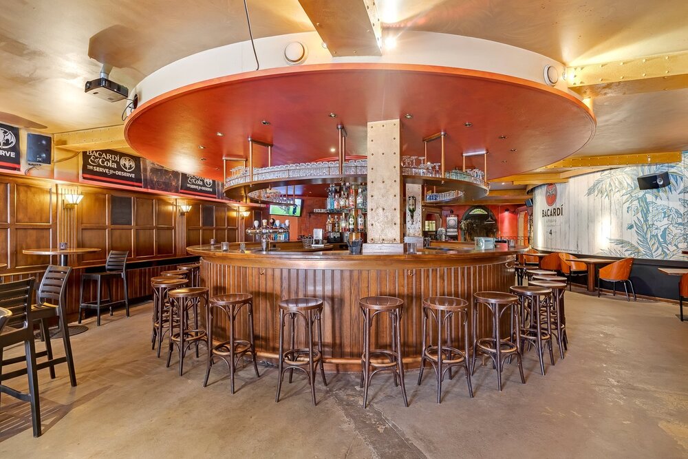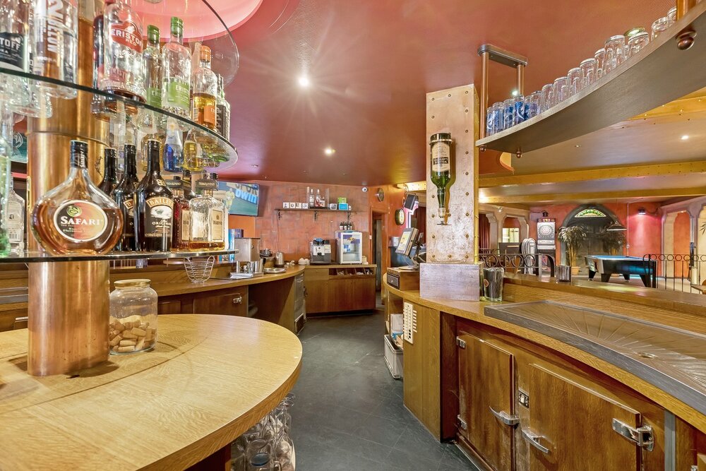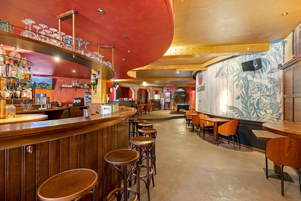 Het handelsgelijkvloers werd uitgebaat als café en beschikt vooraan over een ruim terras waar gasten bij mooi weer kunnen genieten, evenals een overdekt terras. Via een aparte inkomhal betreedt u de zaak, waar u wordt verwelkomd in een indrukwekkende open ruimte met een ronde bar als centraal middelpunt en een dj-booth. Verder zijn er voldoende sanitaire voorzieningen aanwezig. Achteraan bevindt zich een zeer ruime, professioneel ingerichte keuken met aansluitende bijkeuken en extra bergruimte.