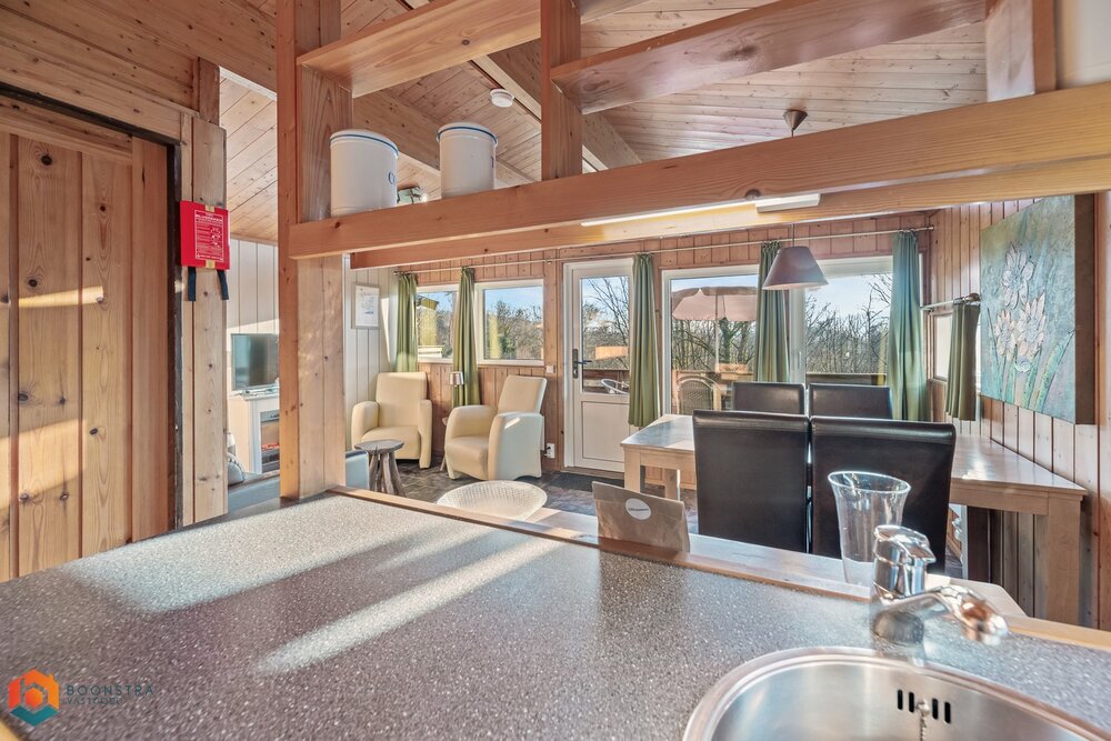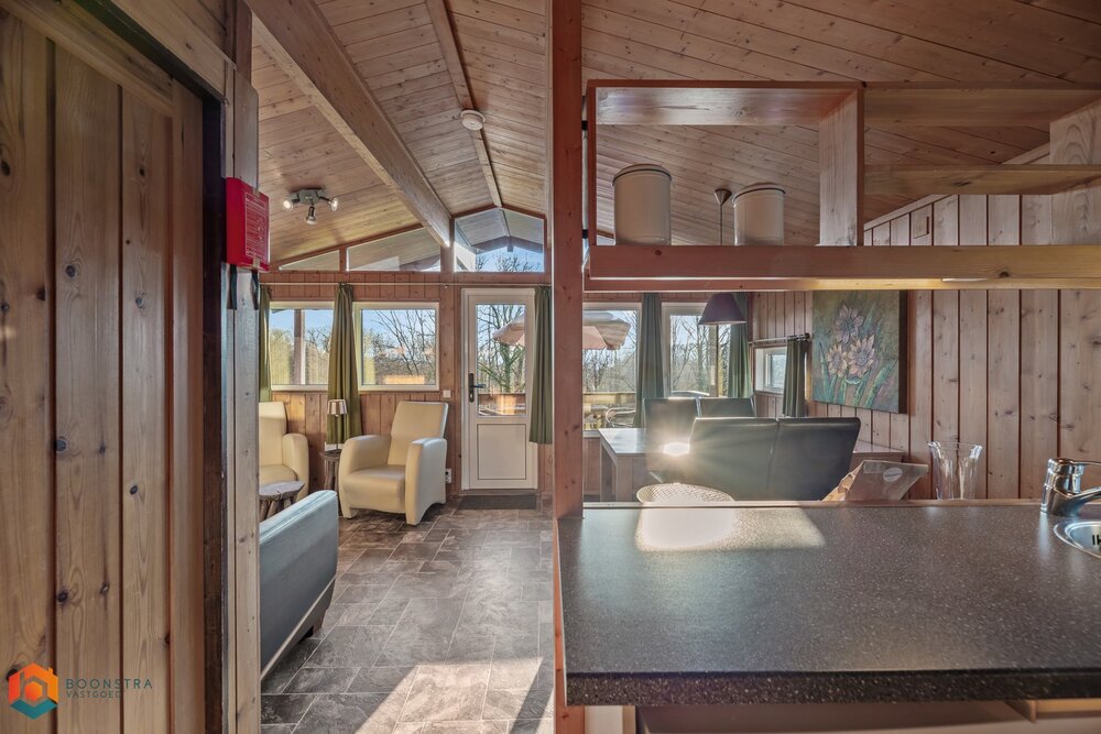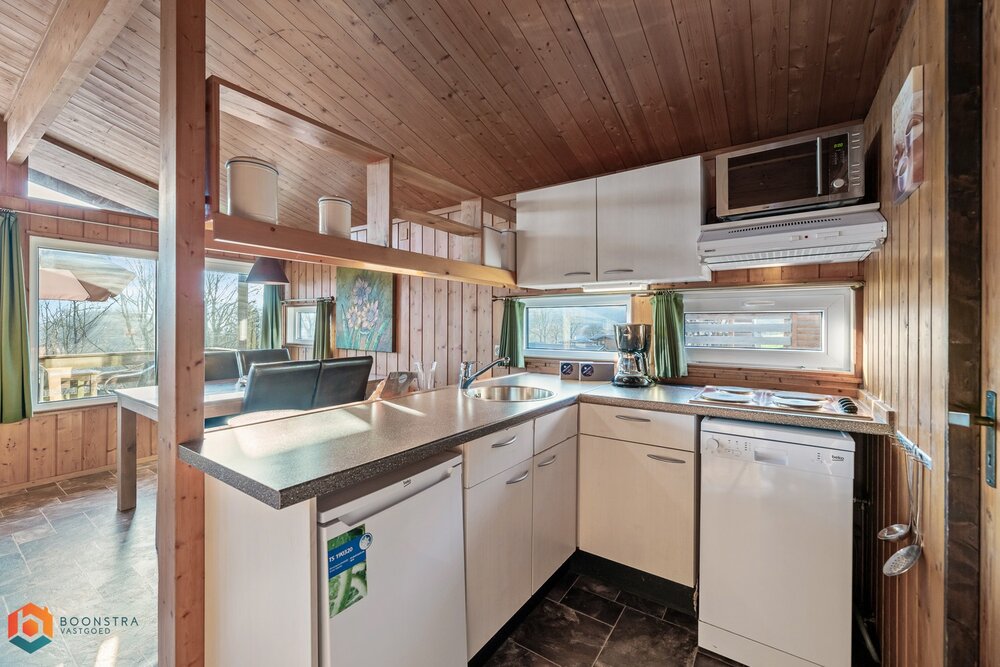 Dit vrijstaande vakantiehuisje is geschikt voor 4 personen. In de gezellige woonkamer vind je een zithoek met een sfeervolle haard en een televisie en is ook een eethoek ingericht. De open keuken is van alle gemakken voorzien, zoals een filterkoffiezetapparaat, een koelkast met vriesvak, een combimagnetron, een vaatwasser en een waterkoker. Het chalet omvat 2 slaapkamers en een badkamer met een douche, een wastafel en een toilet. Buiten is er een omheinde veranda met tuinmeubilair en er is plek om 1 auto te parkeren nabij het huisje.