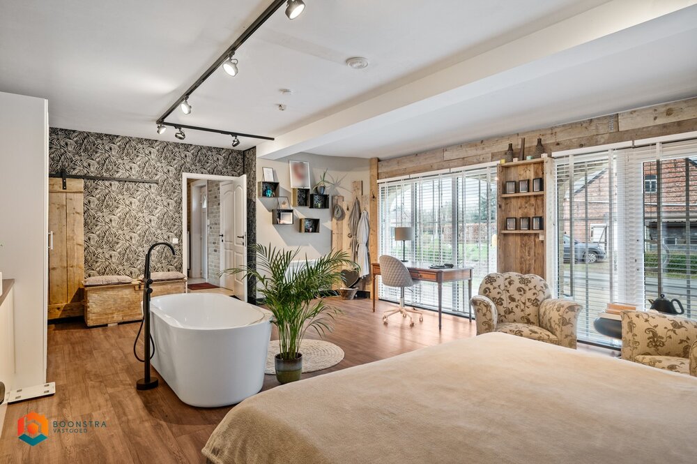 Het gelijkvloers is verder voorzien van een koele berging/wasplaats en een slaapkamer met ensuite badkamer.