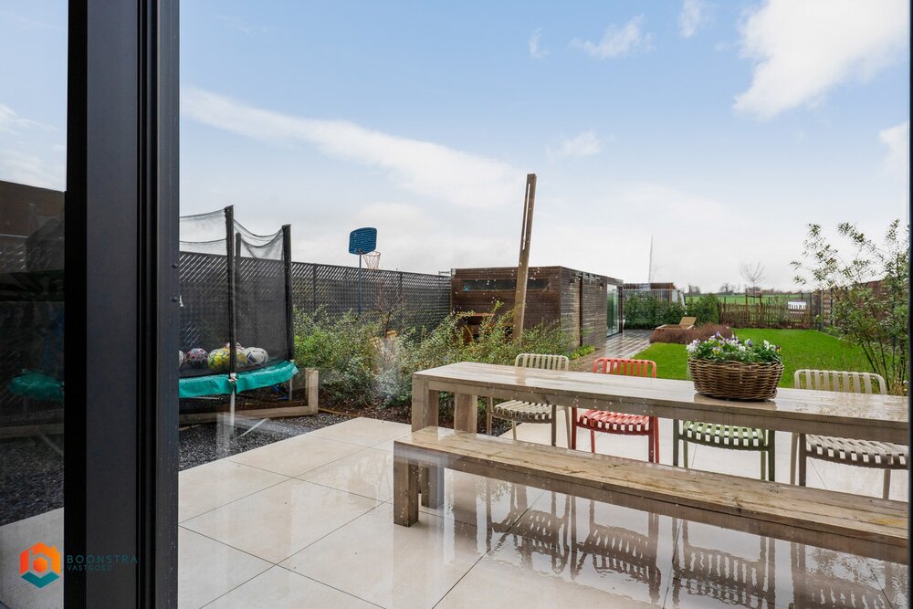 Buiten geniet u in alle rust en privacy van het zonnige terras en de aangrenzende tuin. Daarnaast is er een overdekt terras, afgesloten met grote raampartijen, waar u het hele jaar door kunt vertoeven. De prachtige tuin met weids uitzicht op de omliggende velden vormt de perfecte plek om te ontspannen en te genieten van het buitenleven.