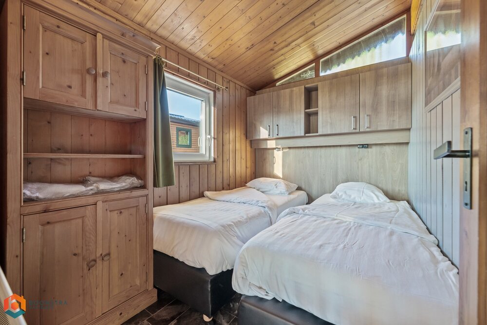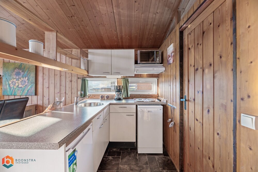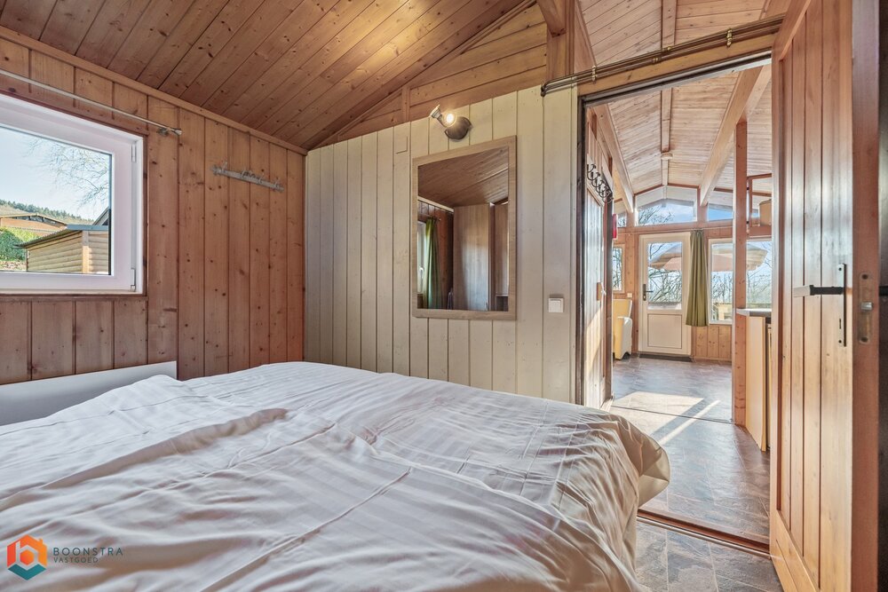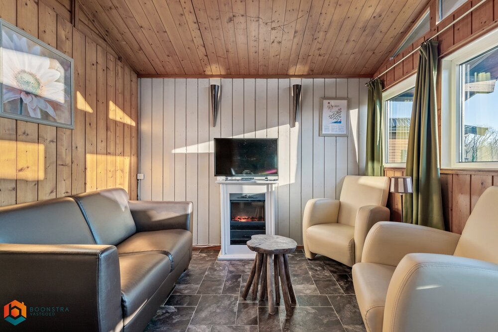 Dit vrijstaande vakantiehuisje is geschikt voor 4 personen. In de gezellige woonkamer vind je een zithoek met een sfeervolle haard en een televisie en is ook een eethoek ingericht. De open keuken is van alle gemakken voorzien, zoals een filterkoffiezetapparaat, een koelkast met vriesvak, een combimagnetron, een vaatwasser en een waterkoker. Het chalet omvat 2 slaapkamers en een badkamer met een douche, een wastafel en een toilet. Buiten is er een omheinde veranda met tuinmeubilair en er is plek om 1 auto te parkeren nabij het huisje.