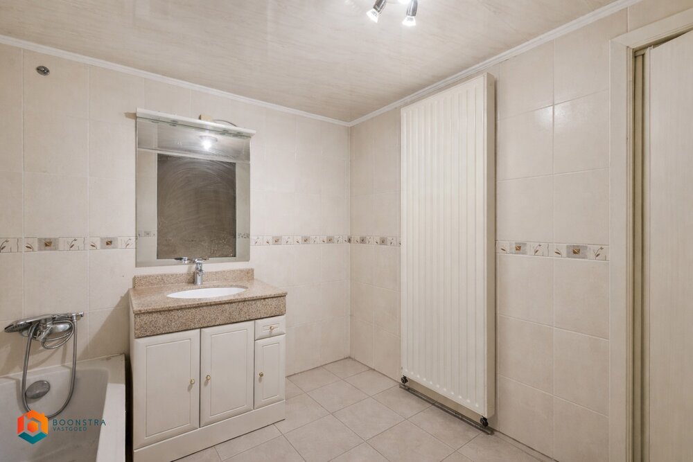 We betreden de woning via inkomhal. De leefruimte kunt u inrichten met een gezellige zithoek en aparte eetplaats. Daarnaast beschikt u op het gelijkvloers over een ruime, geïnstalleerde keuken en de badkamer, uitgerust met ligbad, lavabomeubel en toilet. Aansluitingen voor de wasmachine en droogkast zijn ook aanwezig.