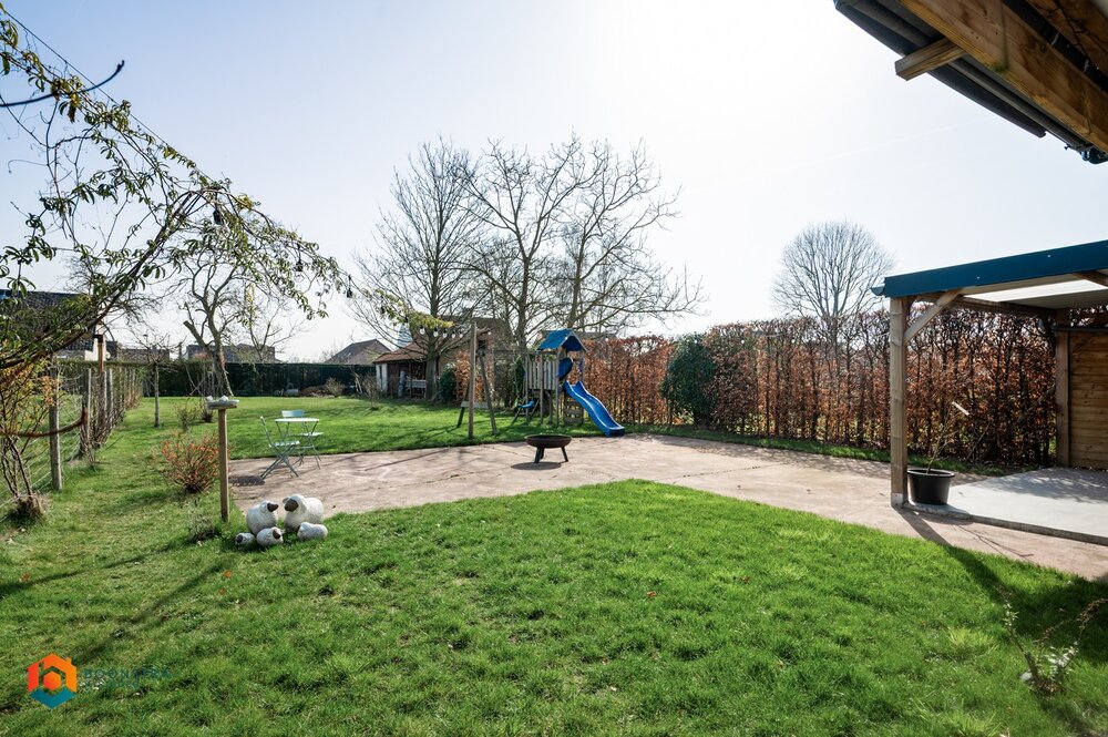 Achter het magazijn vinden we nog een zeer ruime omheinde tuin, voorzien van een overdekte gezellige zithoek waar je kan genieten van de rust en het mooie weer..