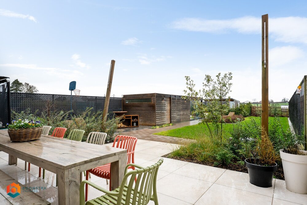 Buiten geniet u in alle rust en privacy van het zonnige terras en de aangrenzende tuin. Daarnaast is er een overdekt terras, afgesloten met grote raampartijen, waar u het hele jaar door kunt vertoeven. De prachtige tuin met weids uitzicht op de omliggende velden vormt de perfecte plek om te ontspannen en te genieten van het buitenleven.