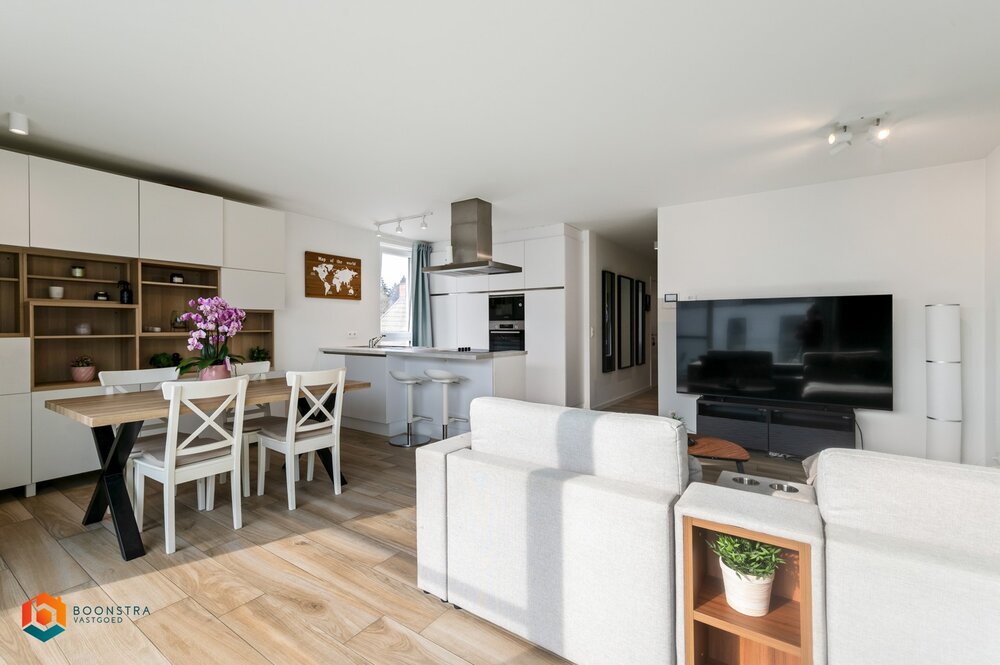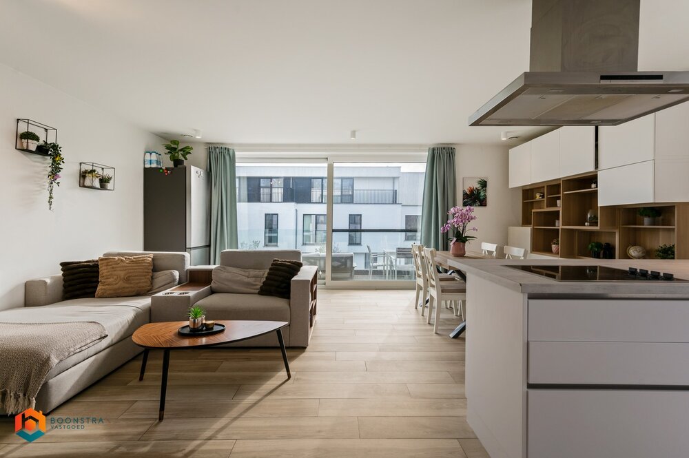 We betreden het appartement via de ruime leefruimte die geniet van veel lichtinval door de grote raampartijen. Hier kan u een gezellige zithoek en eetplaats inrichten. De aangrenzende open keuken is mooi geïntegreerd in het geheel en is voorzien van de voornaamste toestellen. Vanuit de leefruimte betreden we het zuid-gerichte terras, waar u steeds in alle rust en privacy kan genieten van het mooie weer. Verder is het appartement voorzien van 2 slaapkamers, een berging en een badkamer, dewelke uitgerust is met een bad, douche en lavabo. Er is ook een ondergrondse berging inclusief. Verder beschikt het appartement over 1 garagebox, dewelke verplicht bij te huren is voor €80/maand. Het appartement beschikt over zonnepanelen, een warmtepomp, vloerverwarming lichtarmaturen en gordijnen.