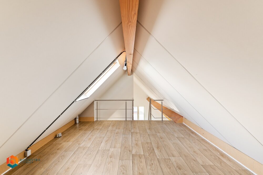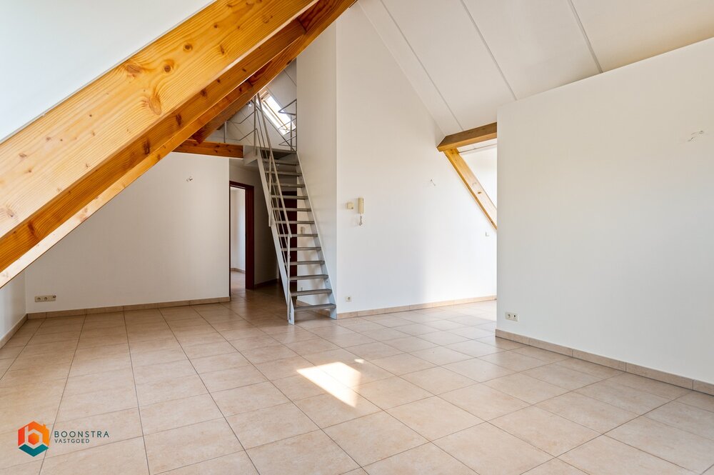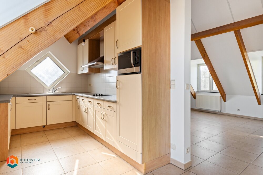 Het appartement bevindt zich op de bovenste verdieping van dit kleinschalig appartementsgebouw. We betreden het appartement via de inkomhal. De ruime leefruimte geniet van veel lichtinval en kan ingericht worden met een gezellige zithoek en eetplaats. De open keuken is mooi geïntegreerd in het geheel en voorzien van kwalitatieve toestellen. De nachthal geeft ons verder toegang tot 1 slaapkamer, een aparte berging en de badkamer uitgerust met lavabo en douchebad. Vanuit de leefruimte kunt u ook de zolder bereiken, momenteel ingericht als tweede slaapkamer. Op het prachtig terras kunt u steeds in alle rust en privacy genieten van het mooie weer. De achtergelegen private garage is verplicht mee bij te huren voor €80 en de gemeenschappelijke kosten bedragen €75 per maand.