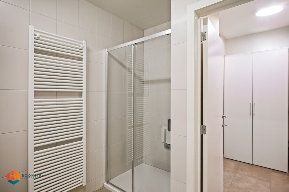 We betreden het appartement via de inkomhal met apart gastentoilet. De lichtrijke leefruimte kunt u inrichten met een gezellige zithoek en aparte eetplaats. Hier is de open keuken mooi geïntegreerd in het geheel en is voorzien van de voornaamste toestellen. Aangrenzend bevindt zich nog een aparte berging/wasruimte. De nachthal geeft ons verder toegang tot de 2 slaapkamers en de badkamer, uitgerust met lavabo, douche en toilet. De slaapkamers zijn voorzien van elektrische rolluiken. Het gehele appartement beschikt reeds over raamdecoratie, vliegenramen en lichtarmaturen. U beschikt ook over een autostaanplaats. Verder is het appartement ook uitgerust met een ventilatiesysteem D, buitenkraantje op regenwater en een waterontharder. Het E-peil bedraagt slechts 45. €50 gemeenschappelijke kost per maand.