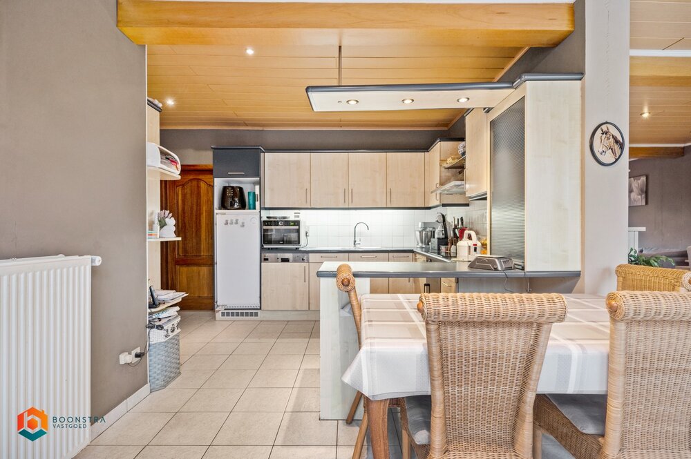 We betreden de woning via de inkomhal met gastentoilet. De lichtrijke leefruimte kan u inrichten met een gezellige zithoek en aparte eetplaats. Aangrenzend aan de leefruimte bevindt zich de halfopen keuken, voorzien van de voornaamste toestellen. Via de keuken hebben we toegang tot de tuin met terras. Hier kan u steeds in alle rust en privacy genieten van het mooie weer. De nachthal op de eerste verdieping geeft ons toegang tot de 3 slaapkamers, apart toilet, bergruimte en de badkamer, voorzien van een dubbele lavabo, douche en ligbad.