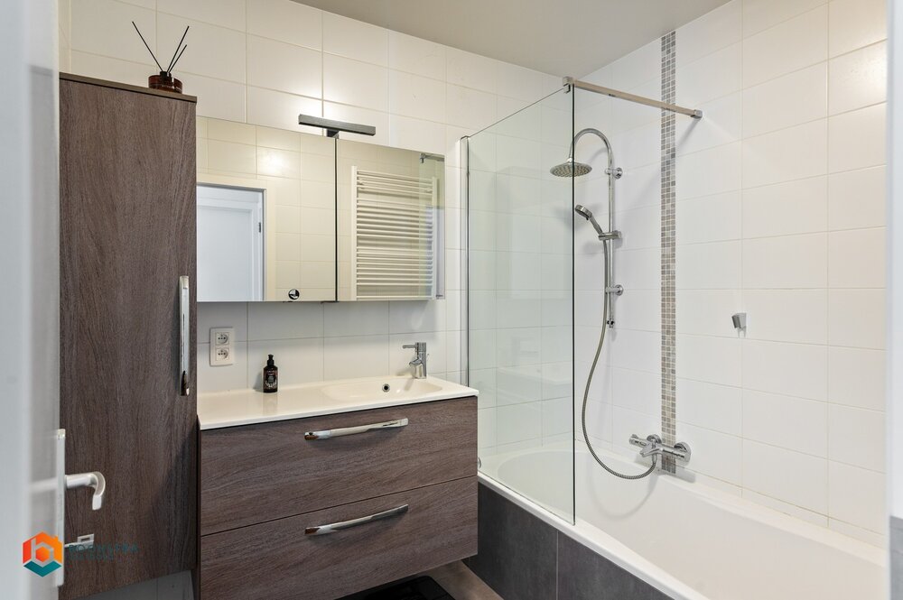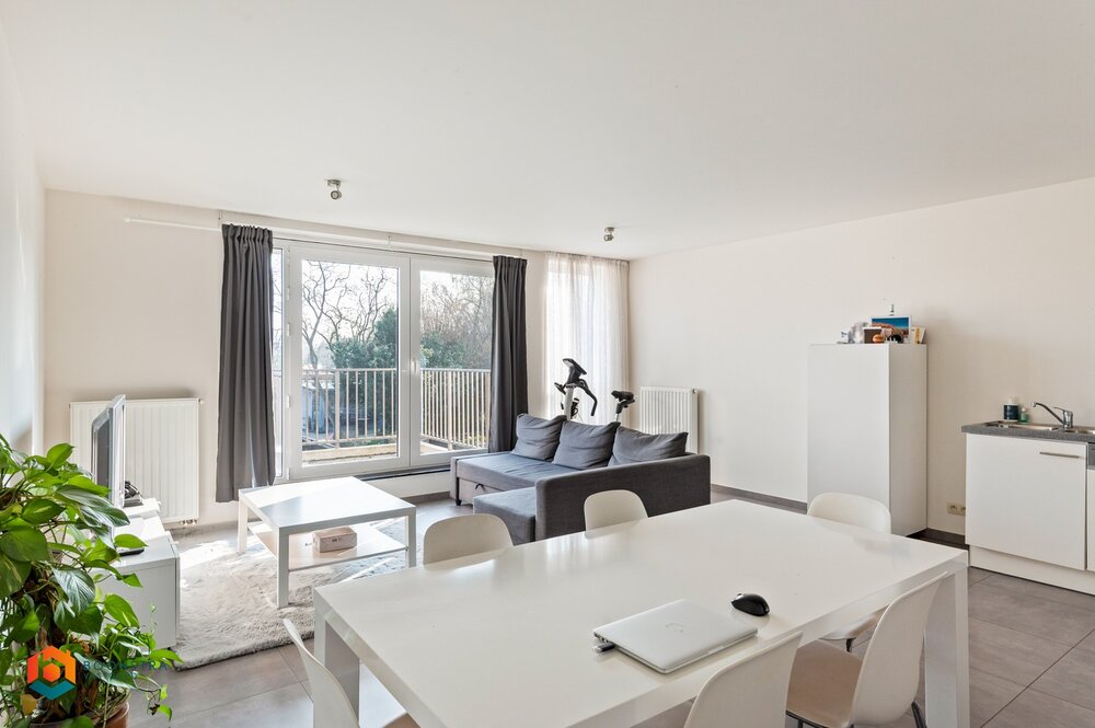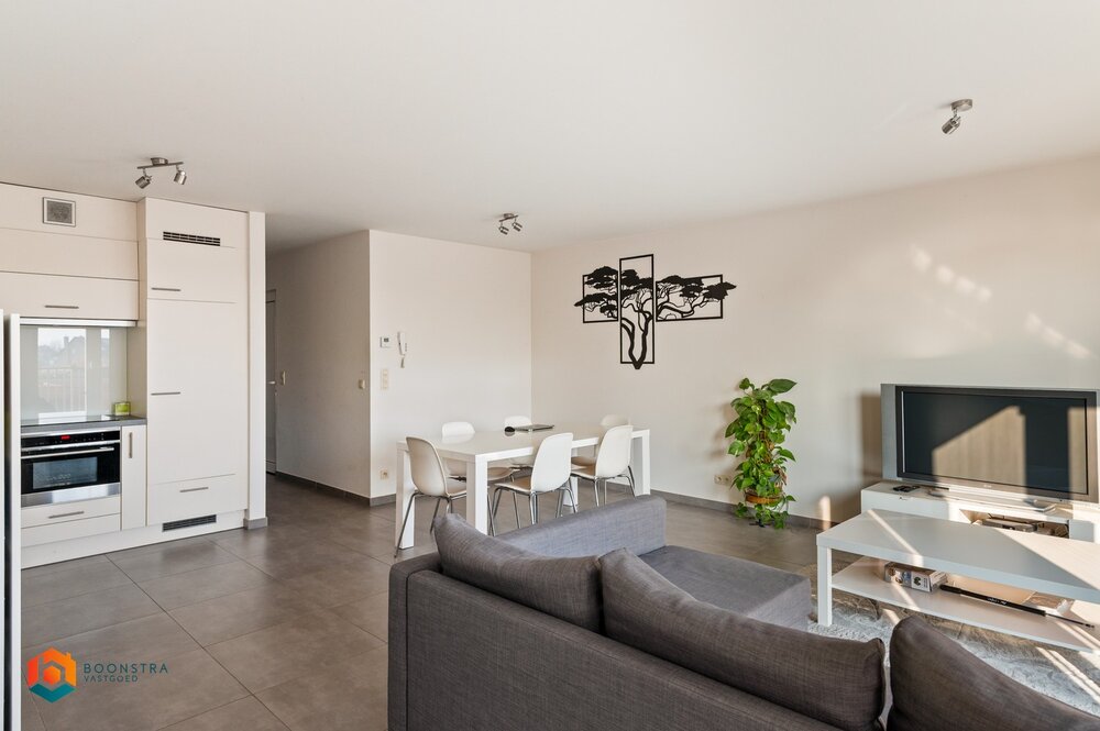 We betreden het appartement via de ruime leefruimte die geniet van veel lichtinval door de grote raampartijen. Hier kan u een gezellige zithoek en eetplaats inrichten. De aangrenzende open keuken is mooi geïntegreerd in het geheel en is voorzien van de voornaamste toestellen. Vanuit de leefruimte betreden we het terras, waar u steeds in alle rust en privacy kan genieten van het mooie weer. Verder is het appartement voorzien van 2 slaapkamers, een berging en een badkamer, dewelke uitgerust is met een douchebad en lavabo.