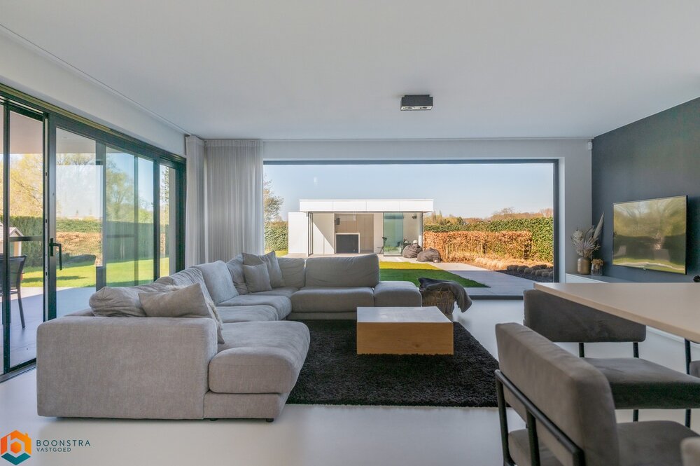 De leefruimte geeft rechtstreeks uit op de tuin en het gunstig georiënteerde terras. In de tuin vindt u een zwembad met een volledig ingericht poolhouse, waar de grote schuiframen zorgen voor een naadloze overgang tussen de binnen- en buitenruimte. Een ideale plek om tot rust te komen en te genieten in alle privacy. Tenslotte beschikt het gelijkvloers nog over een praktische berging naast de keuken, met aansluiting voor was- en droogmachine, evenals een ruime garage.