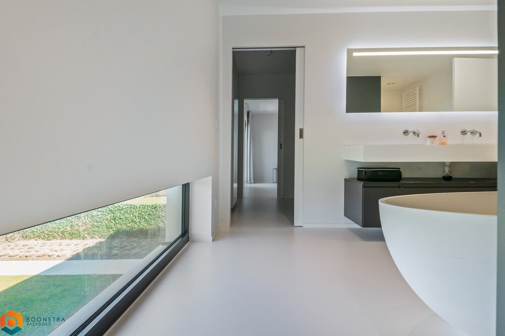 Op de eerste verdieping bevinden zich drie volwaardige slaapkamers, waaronder een master bedroom met en-suite dressing. De nachthal biedt tevens toegang tot een apart toilet en een ruime, stijlvolle badkamer uitgerust met een dubbele lavabo, inloopdouche en vrijstaand ligbad.