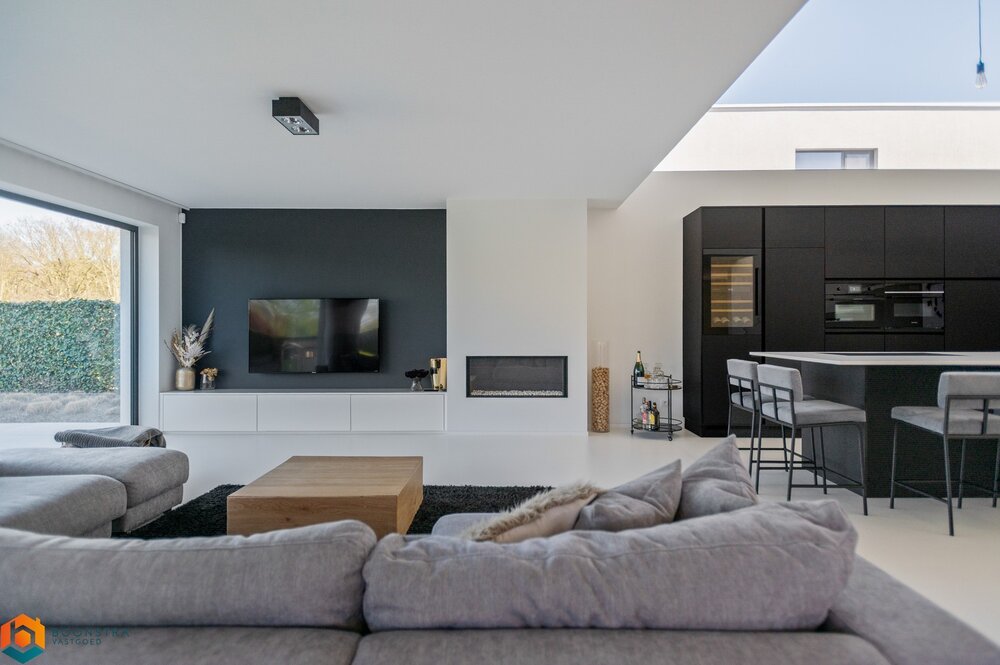 We betreden deze stijlvolle villa, met een royale bewoonbare oppervlakte van maar liefst 294 m², via een lichtrijke inkomhal met apart gastentoilet. De indrukwekkende leefruimte bestaat uit een zonovergoten zithoek met gashaard en een ruime eetplaats. De grote raampartijen bieden een prachtig zicht op de volledig aangelegde tuin. Daarnaast zorgen de doordachte architectuur en de vide voor een unieke beleving en een overvloed aan natuurlijk licht. De open keuken met een hoogwaardige afwerking is mooi geïntegreerd in het geheel en werd uitgerust met een kookeiland en kwalitatieve toestellen.